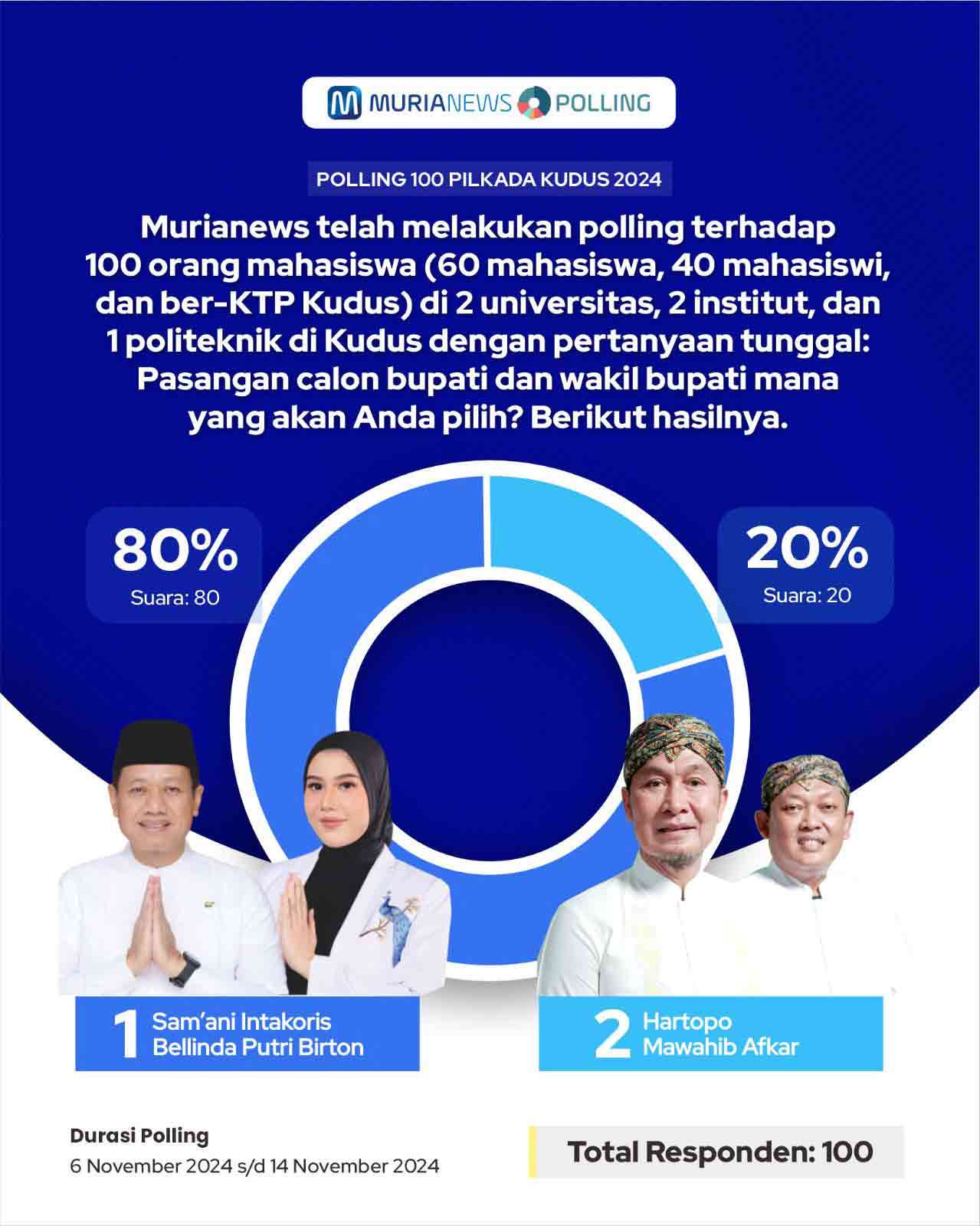 Murianews menggelar Polling 100 kepada kalangan mahasiswa. Polling ini melibatkan 100 mahasiswa terdiri dari 60 mahasiswa dan 40 mahasiswi yang ber-KTP Kudus.