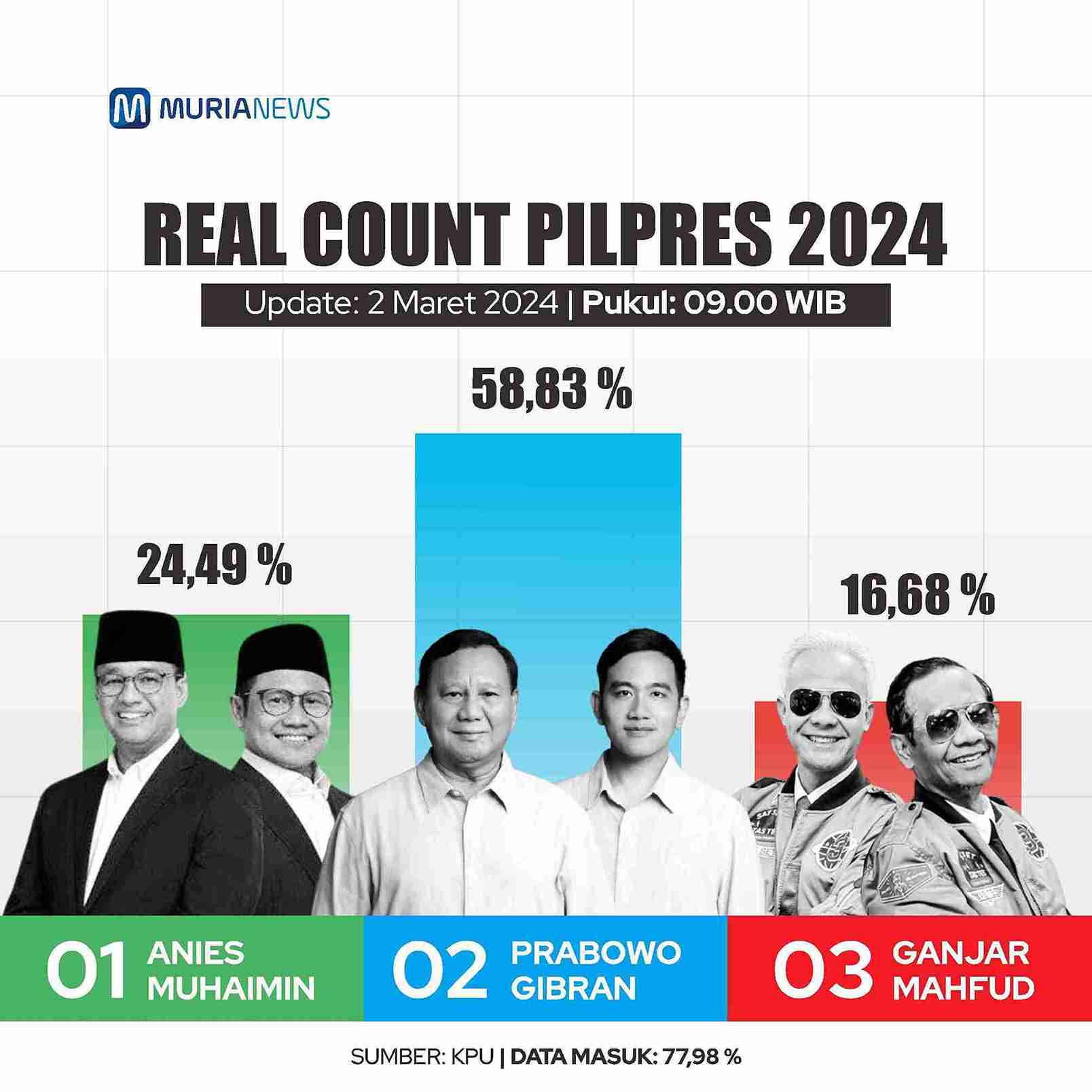 Murianews, Kudus – Komisi Pemilihan Umum (KPU) RI mengeluarkan hasil real count dari penghitungan suara Pilpres 2024. Hingga Sabtu (2/3/2024) pukul 09.00 WIB, suara yang masuk sudah mencapai 77,98 persen.