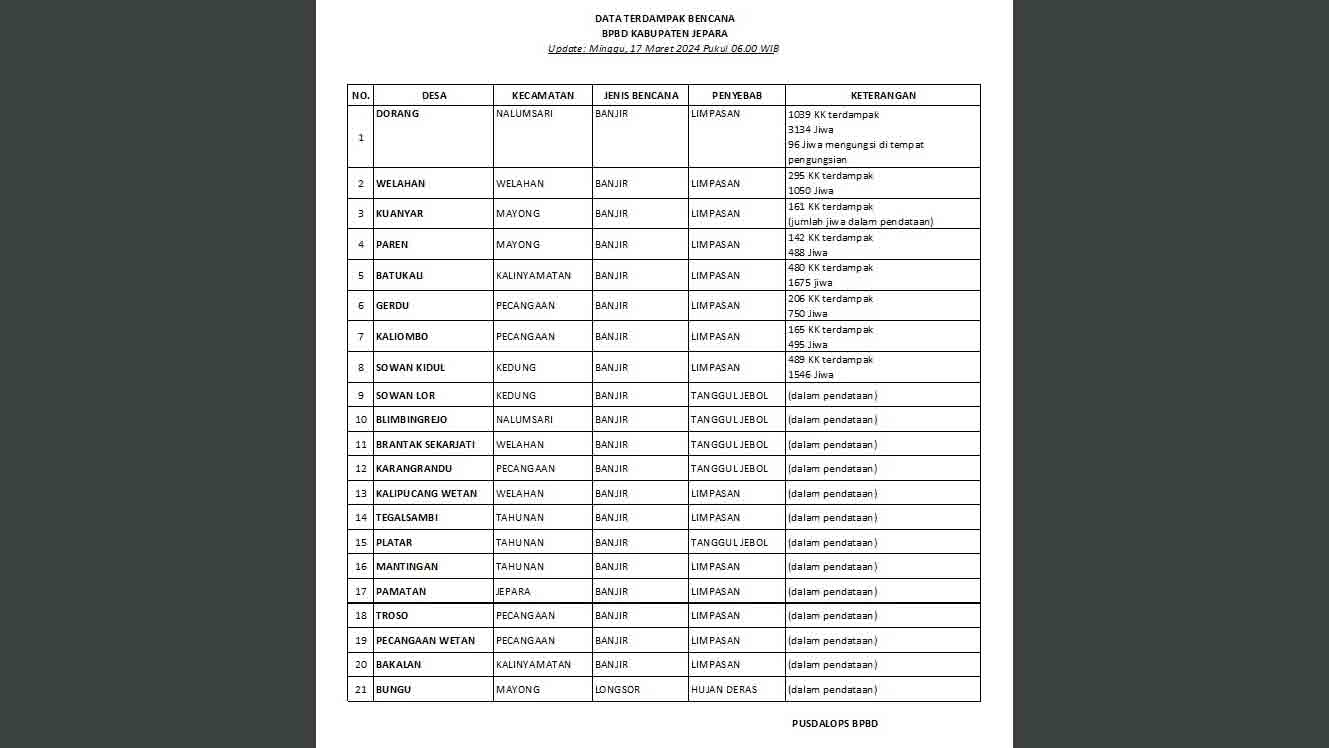 Arwin menyebutkan, 24 desa tersebut tersebar di delapan kecamatan. Rinciannya, di Kecamatan Welahan banjir merendam Desa Welahan dengan jumlah terdampak 295 kepala keluarga (KK) atau 1050 jiwa. Lalu di Desa Brantak Sekarjati, Kalipucang Wetan dan Ujungpandan, masih dalam pendataan oleh BPBD.