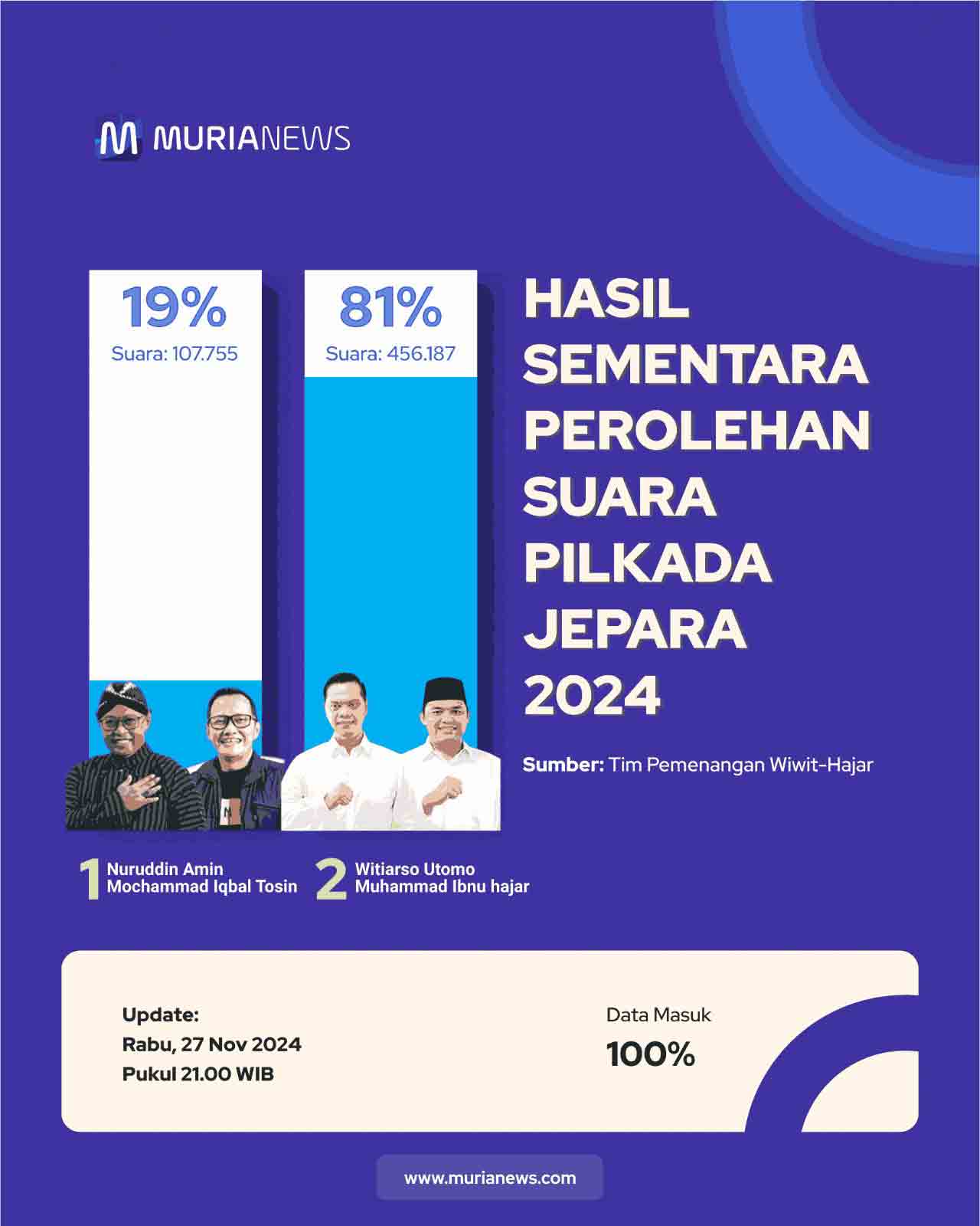 Murianews, Jepara – Pasangan calon (paslon) bupati dan wakil bupati Jepara Nomor urut 2, Witiarso Utomo-Muhammad Ibnu Hajar (Wiwit-Hajar) mengklaim menang telak atas lawannya di Pilkada Jepara 2024.