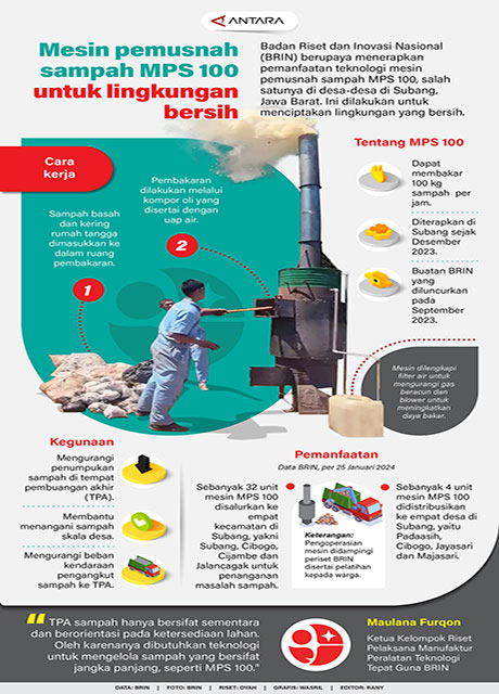 Murianews, Jakarta – Badan Riset dan Inovasi Nasional (BRIN) berupaya menetapkan pemanfaatan teknologi mesin pemusnah sampah MPS 100, salah satunya di desa-desa di Subang, Jawa Barat. Ini dilakukan untuk menciptakan lingkungan yang bersih. (nad)