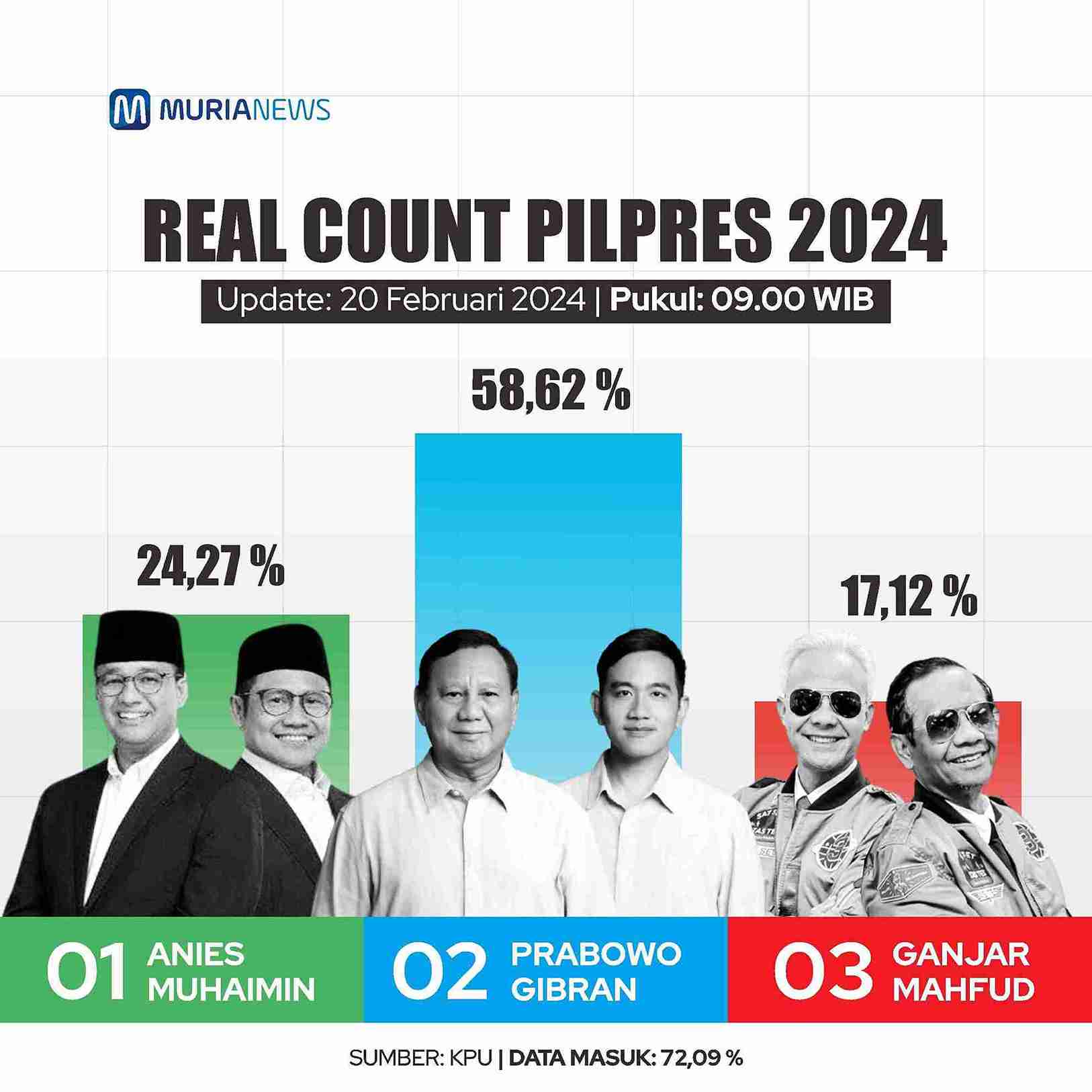 Murianews, Kudus – Update perhitungan suara Pilpres 2024 versi real count KPU RI, Selasa (20/2/2024) pukul 09.00 WIB telah mencapai 72,09 persen data yang masuk.