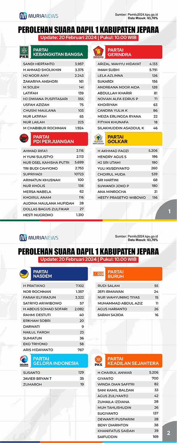 Murianews, Jepara – Komisi Pemilihan Umum (KPU) RI mengeluarkan update suara pileg DPRD Jepara melalui real count. Hingga Selasa (20/2/2024) pukul 10.00 WIB, update suara Pileg DPRD Jepara Dapil 1 sudah mencapai 75,03 persen.