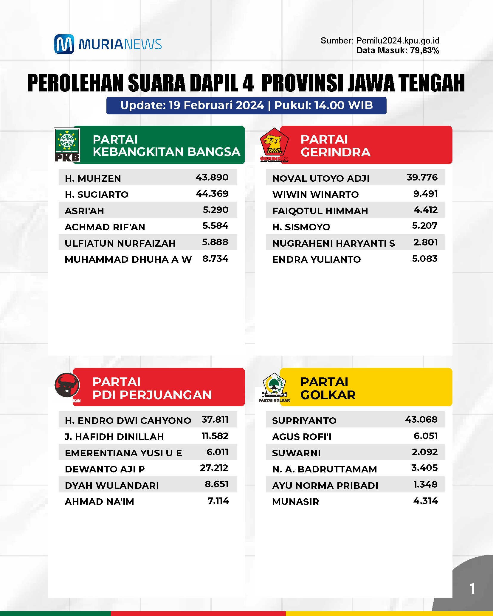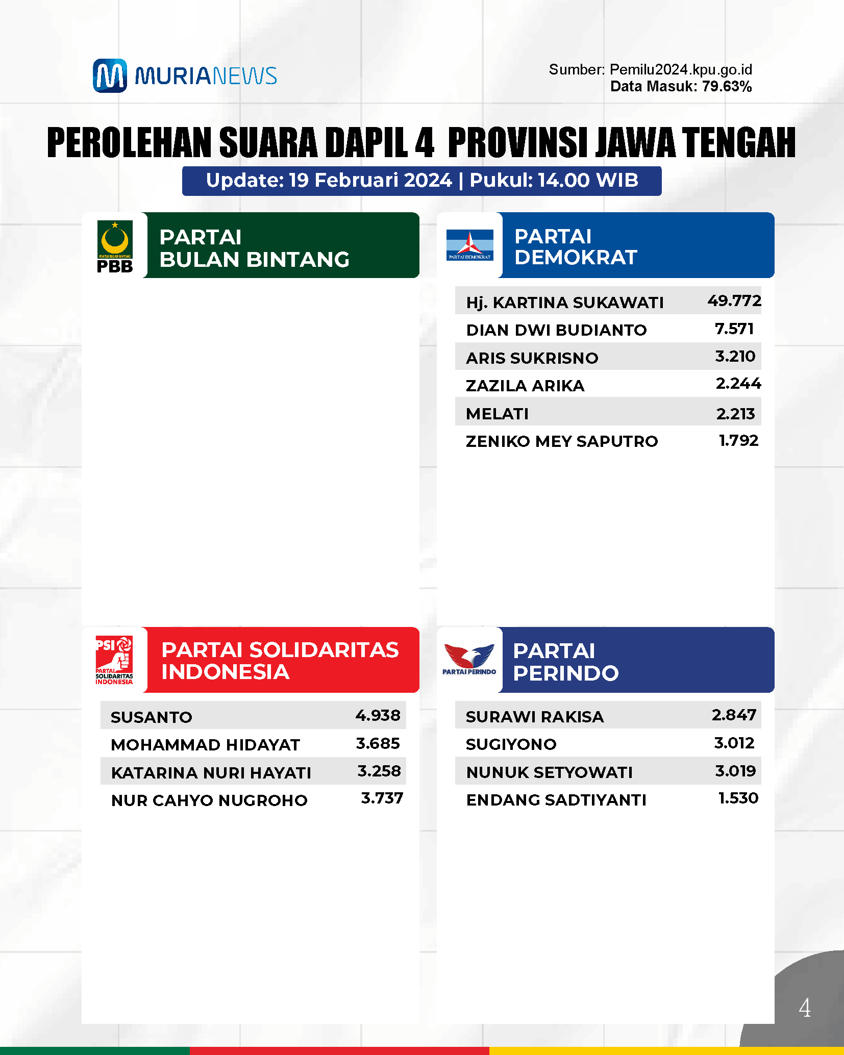 Murianews, Kudus – Komisi Pemilihan Umum (KPU) RI mengeluarkan update suara pileg DPRD Grobogan melalui real count. Hingga Selasa (20/2/2024) pukul 14.00 WIB, update suara Pileg DPRD Jateng Dapil 4 sudah mencapai 79,63 persen.