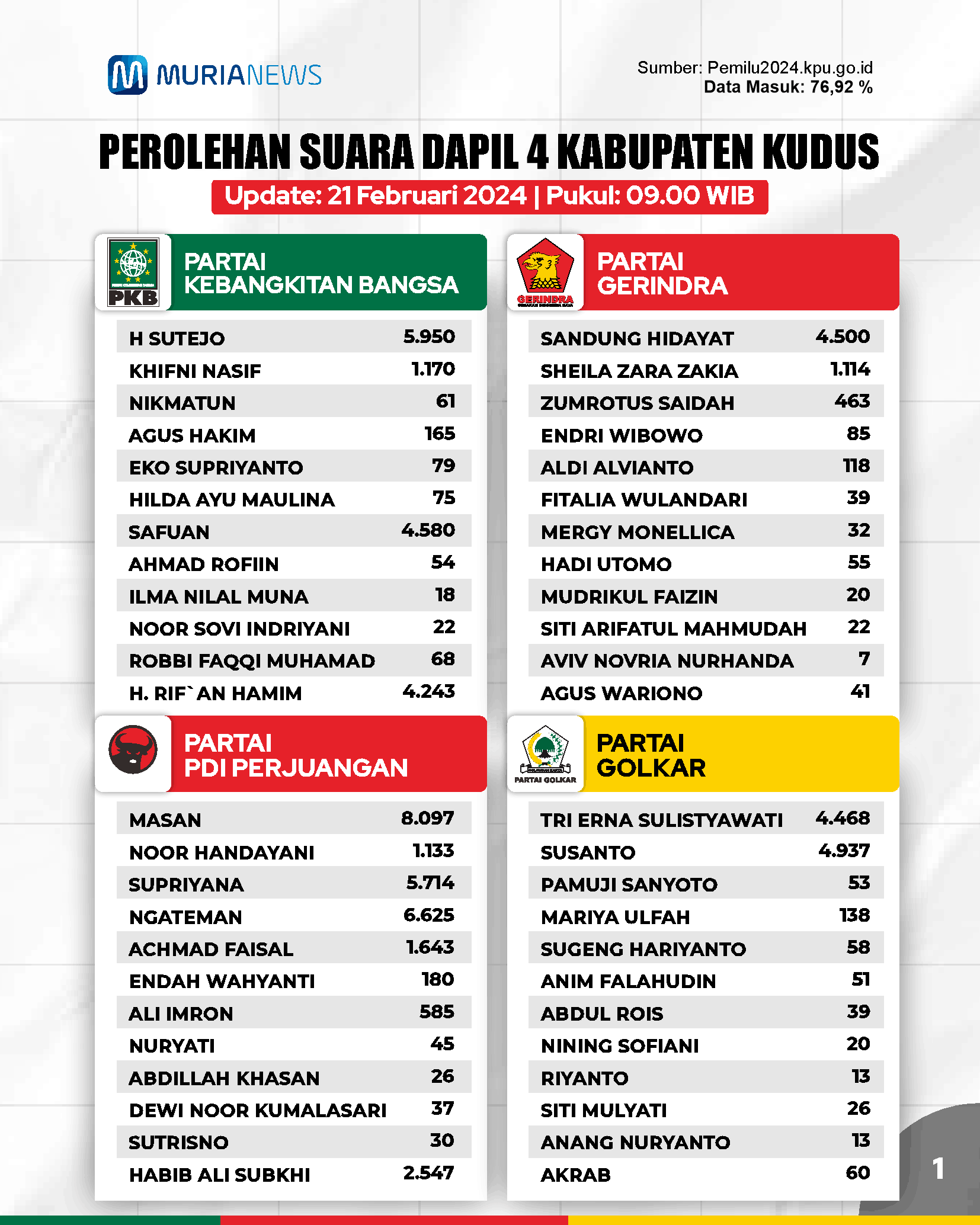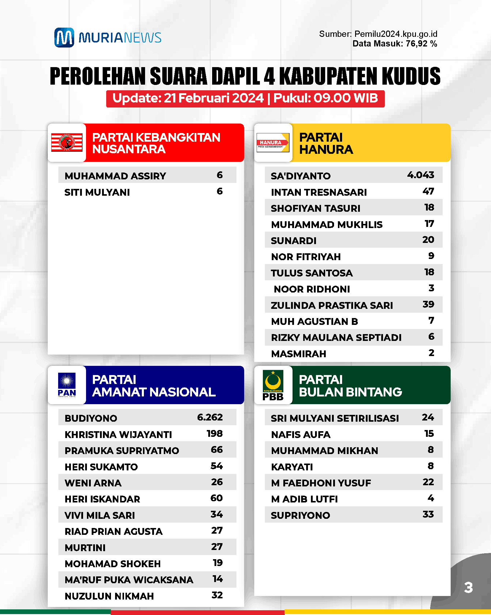 Murianews, Kudus – Komisi Pemilihan Umum (KPU) RI mengeluarkan update suara pileg DPRD Kudus melalui real count. Hingga Rabu (21/2/2024) pukul 10.00 WIB, update suara Pileg DPRD Kudus Dapil 4 sudah mencapai 76,92 persen.