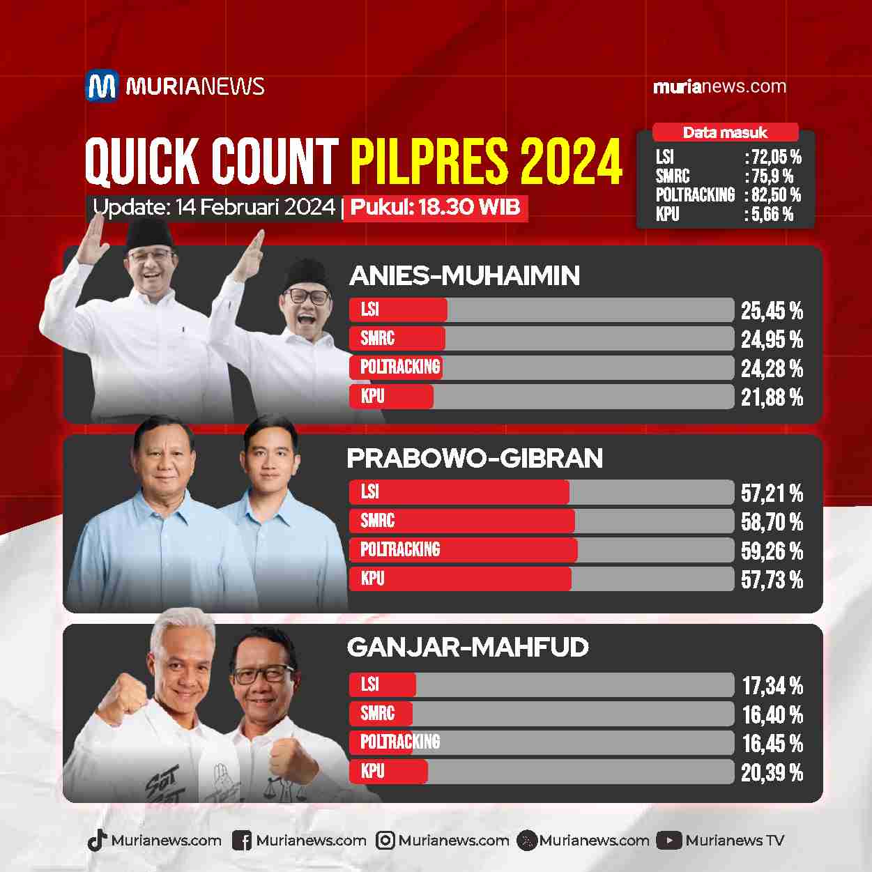 Murianews – Sejumlah lembaga survei telah mengeluarkan hasil hitung cepat atau quick count Pilpres 2024 yang digelar Rabu (14/2/2024) hari ini.