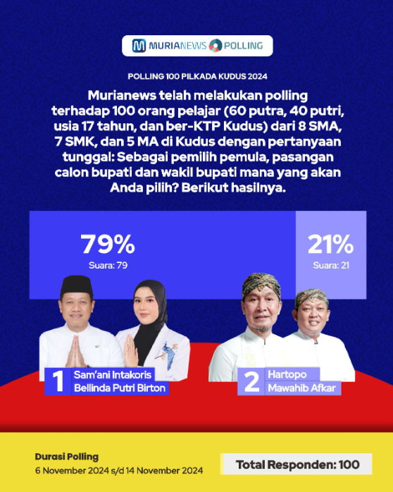 Adapun hasilnya diketahui sebanyak 79 responden atau 79 persen, memilih pasangan Samani Intakoris dan Bellinda Birton untuk menjadi Bupati dan Wakil Bupati Kudus 2024.