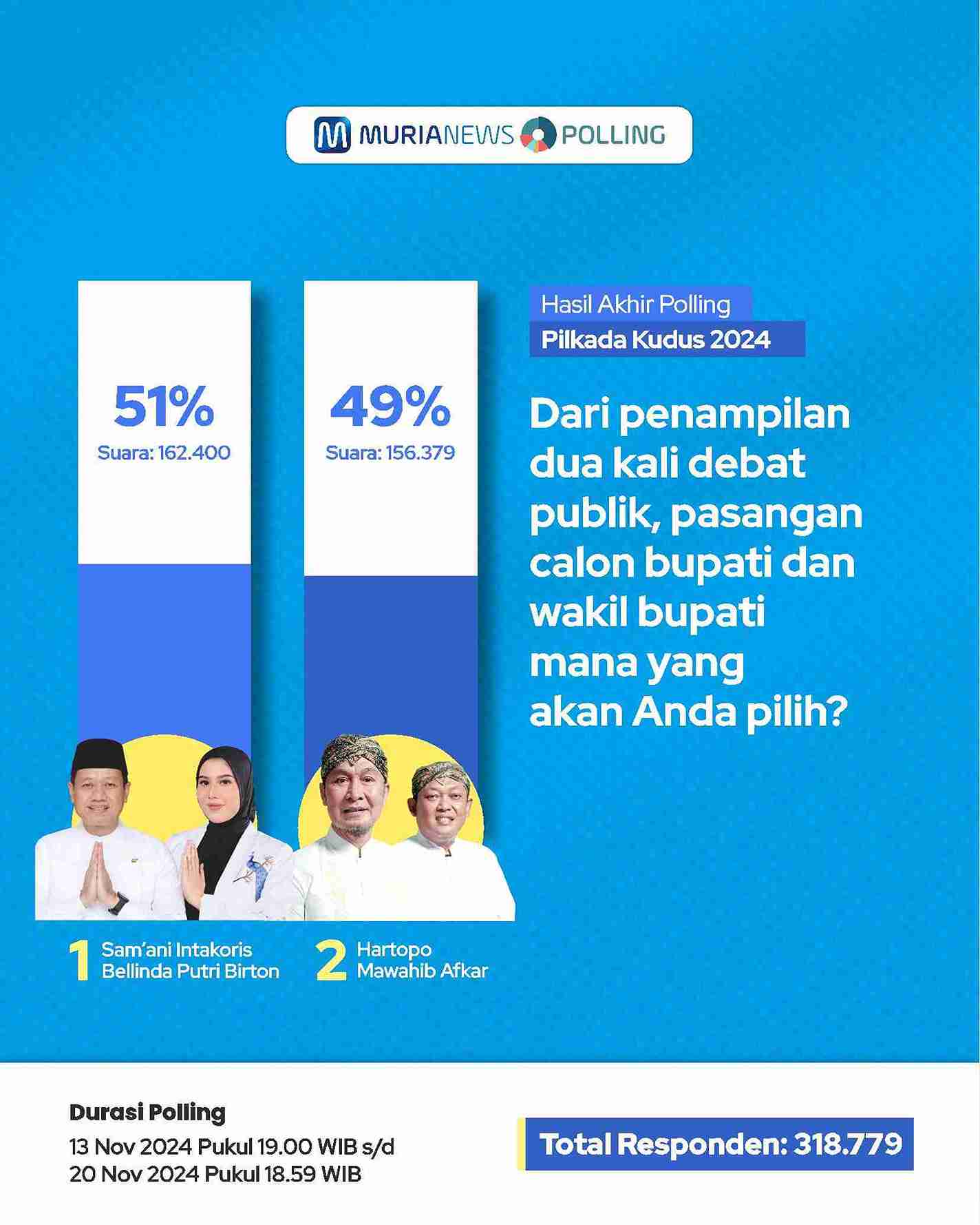 Polling ini dilakukan sejak tanggal 13 November 2024 pukul 18.00 WIB dan berakhir pada 20 November 2024 pukul 18.59 WIB, dengan total responden sebanyak 318.779 responden.
