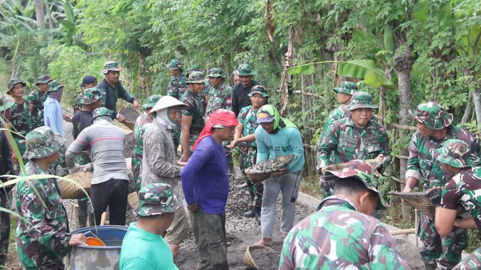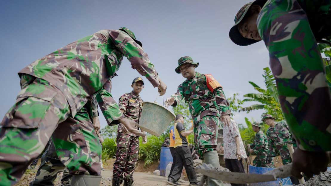 Satu titik tampak membangun jalan. Di titik lainnya, membangun jembatan. Ada juga yang mempercantik rumah ibadah. Di titik satunya, beda lagi. Pria-pria berbadan tegak berseragam loreng ini tampak membangunkan sebuah water closet di sejumlah rumah warga setempat.