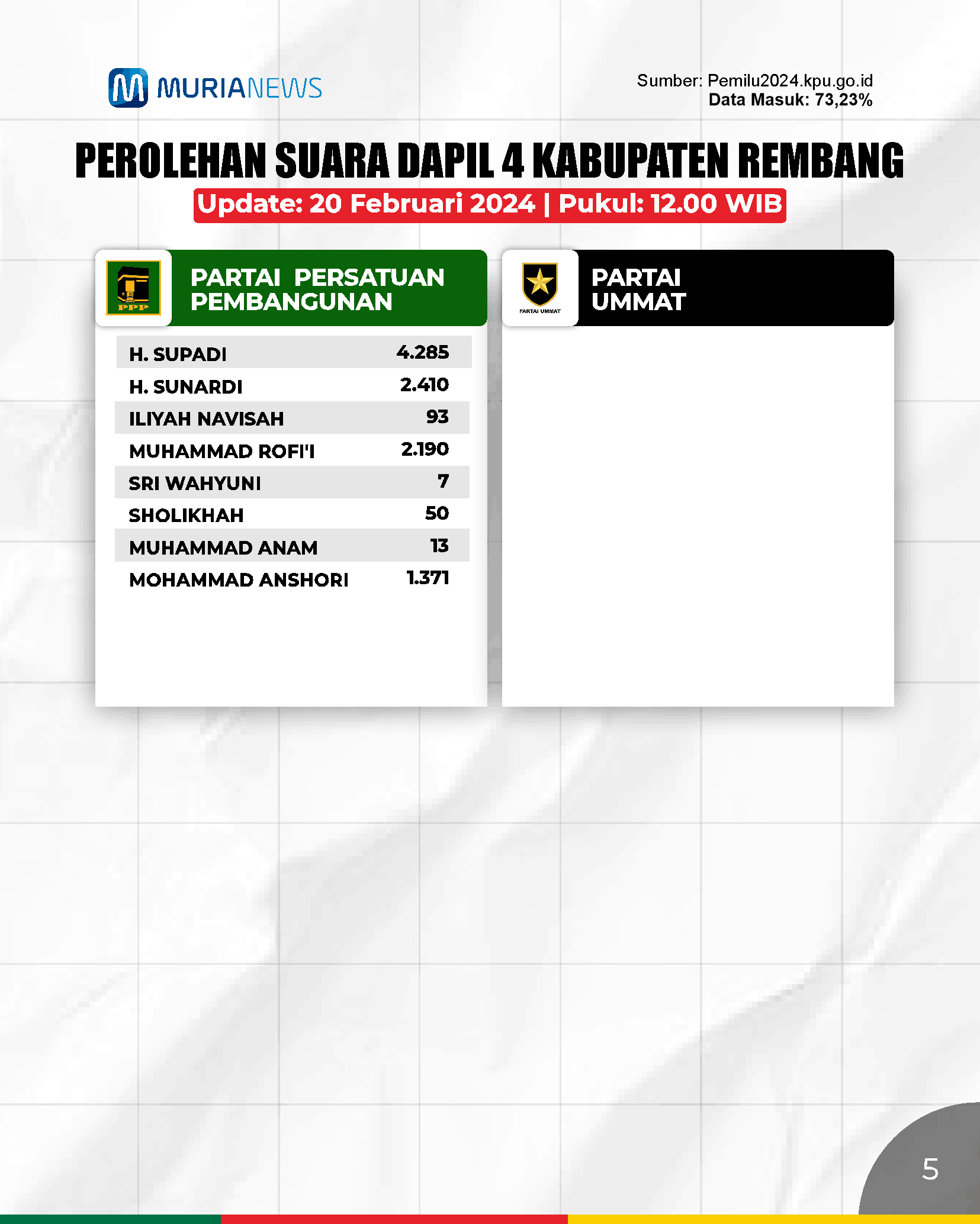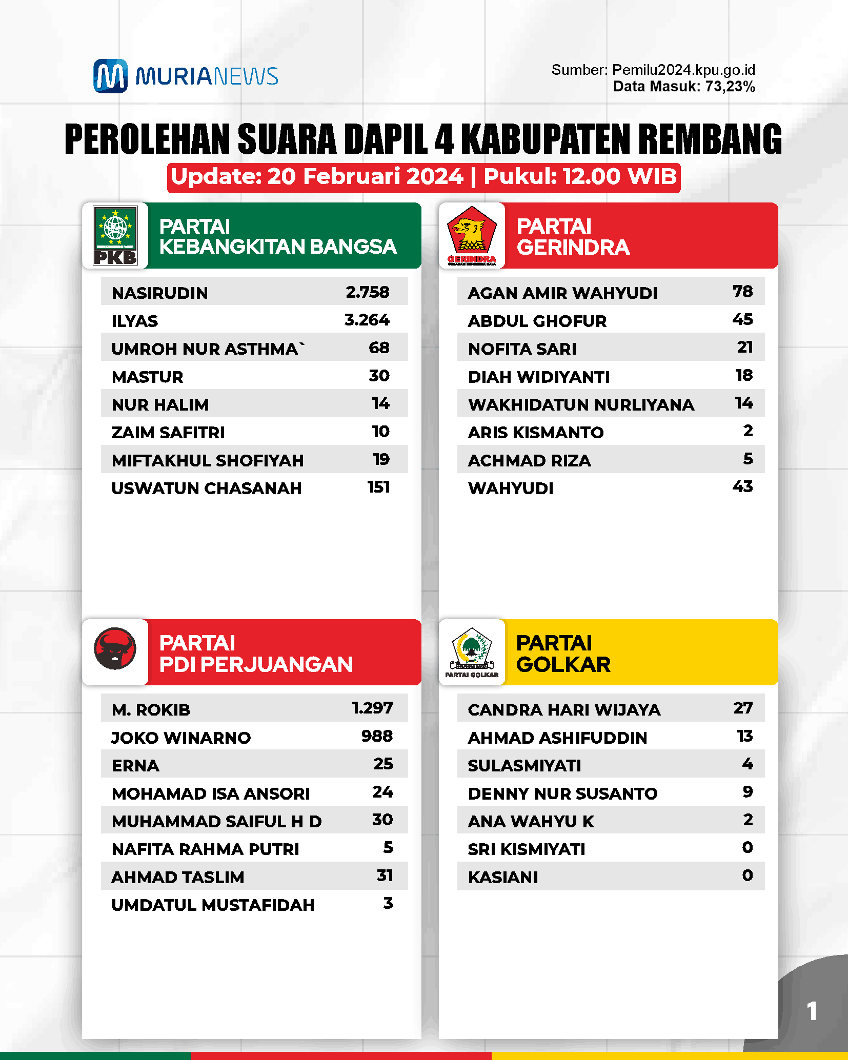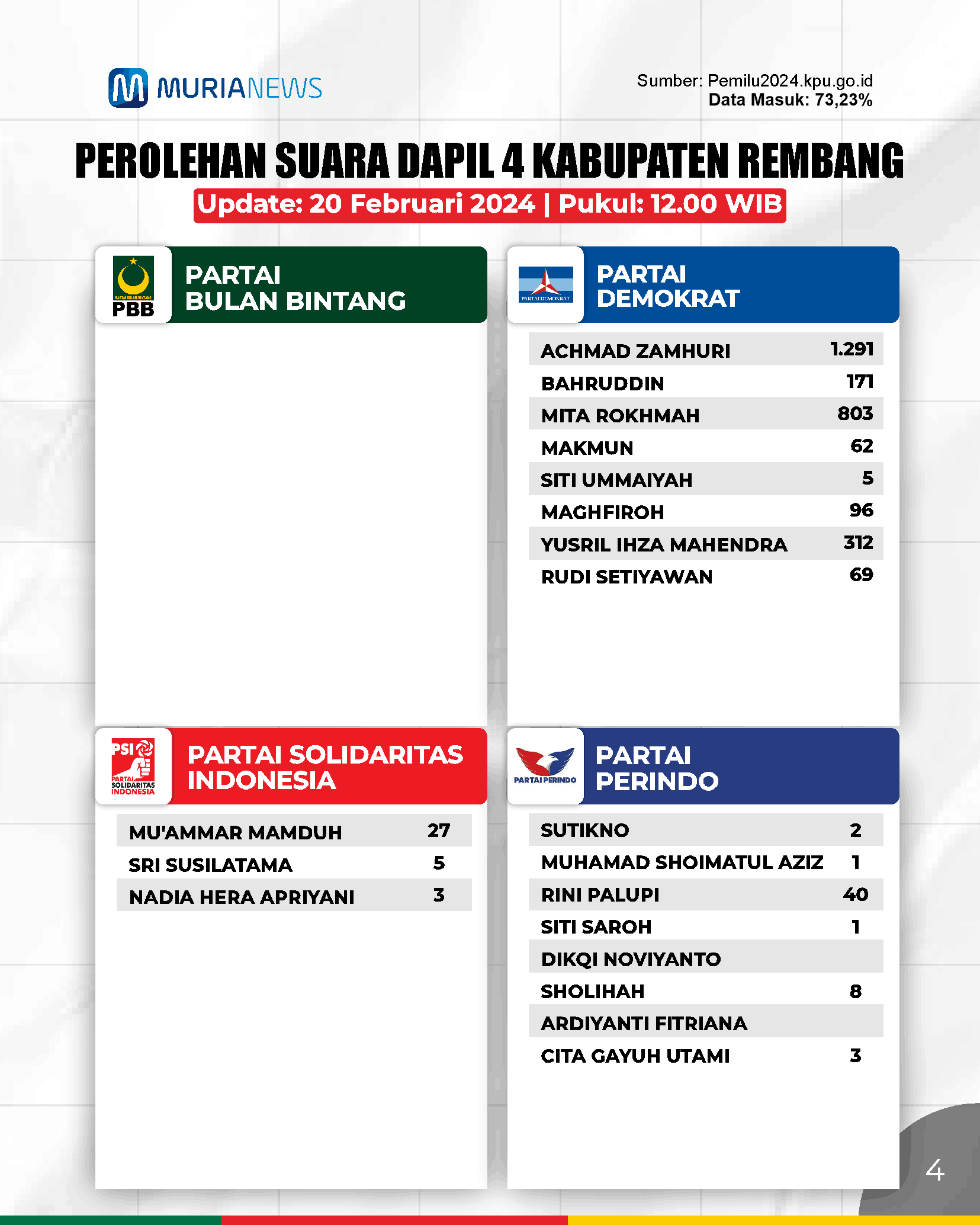 Murianews, Rembang – Komisi Pemilihan Umum (KPU) RI mengeluarkan update suara pileg DPRD Rembang melalui real count. Hingga Selasa (20/2/2024) pukul 12.00 WIB, update suara Pileg DPRD Remang Dapil 4 sudah mencapai 73,23 persen.