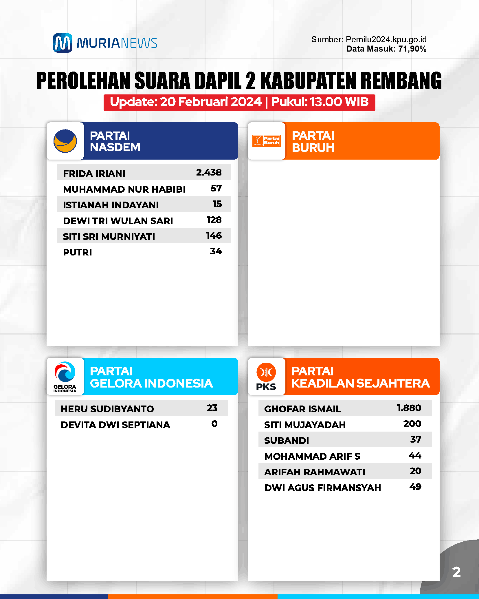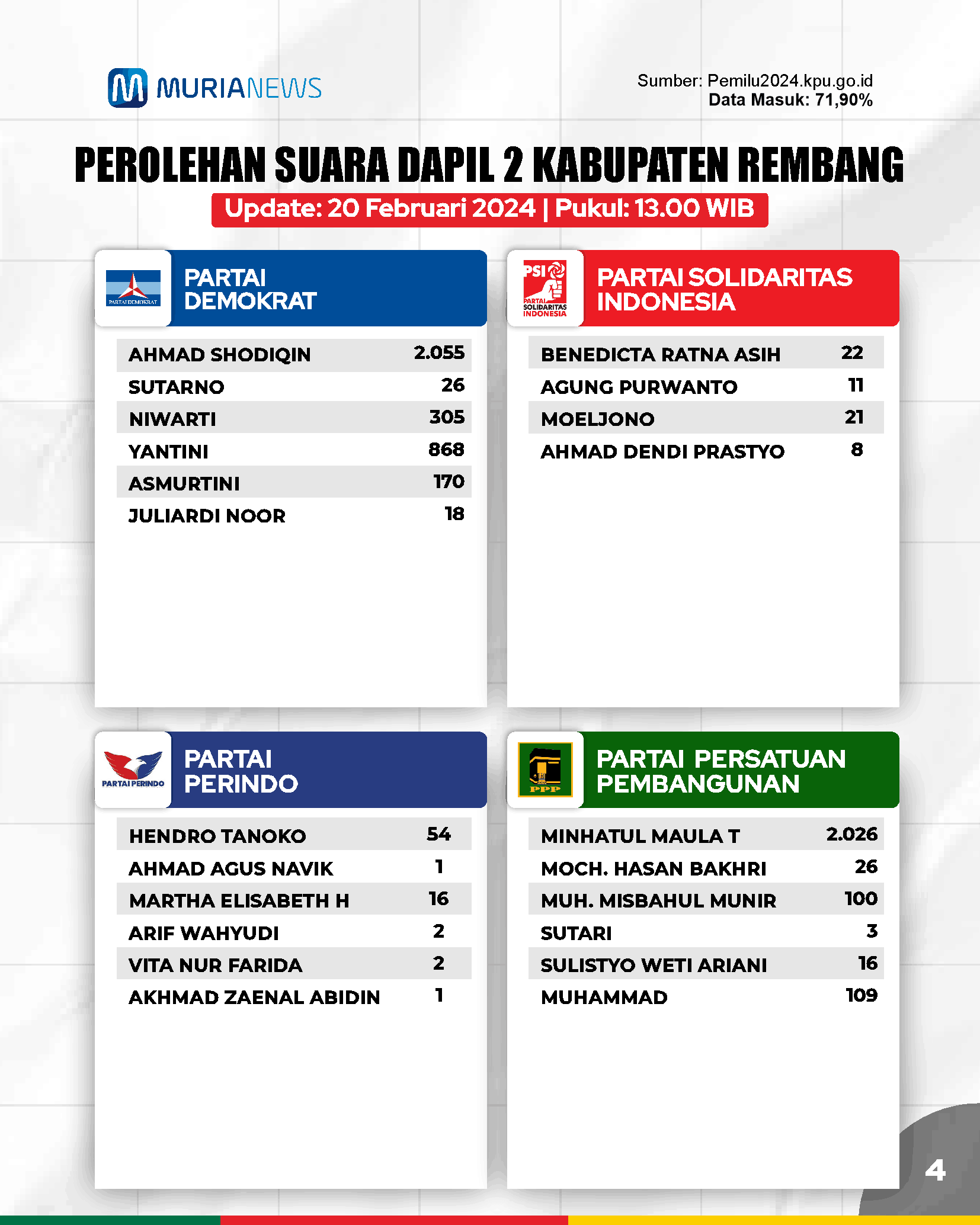 Murianews, Rembang – Komisi Pemilihan Umum (KPU) RI mengeluarkan update suara pileg DPRD Rembang melalui real count. Hingga Selasa (20/2/2024) pukul 13.00 WIB, update suara Pileg DPRD Remang Dapil 2 sudah mencapai 71,90 persen.