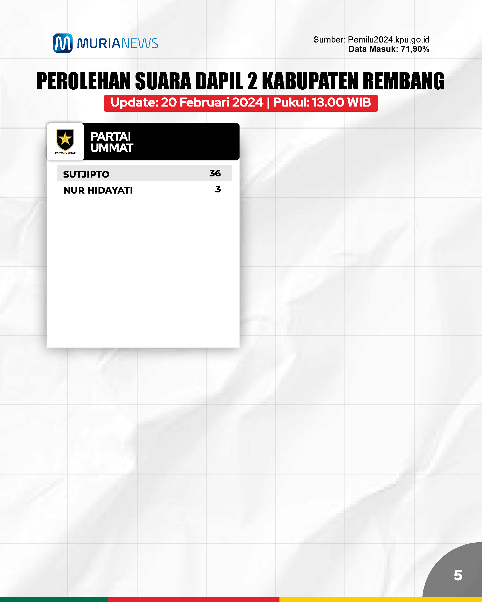 Berikut hasil sementara real count Pileg DPRD Rembang 2024 Dapil 2 dari KPU: