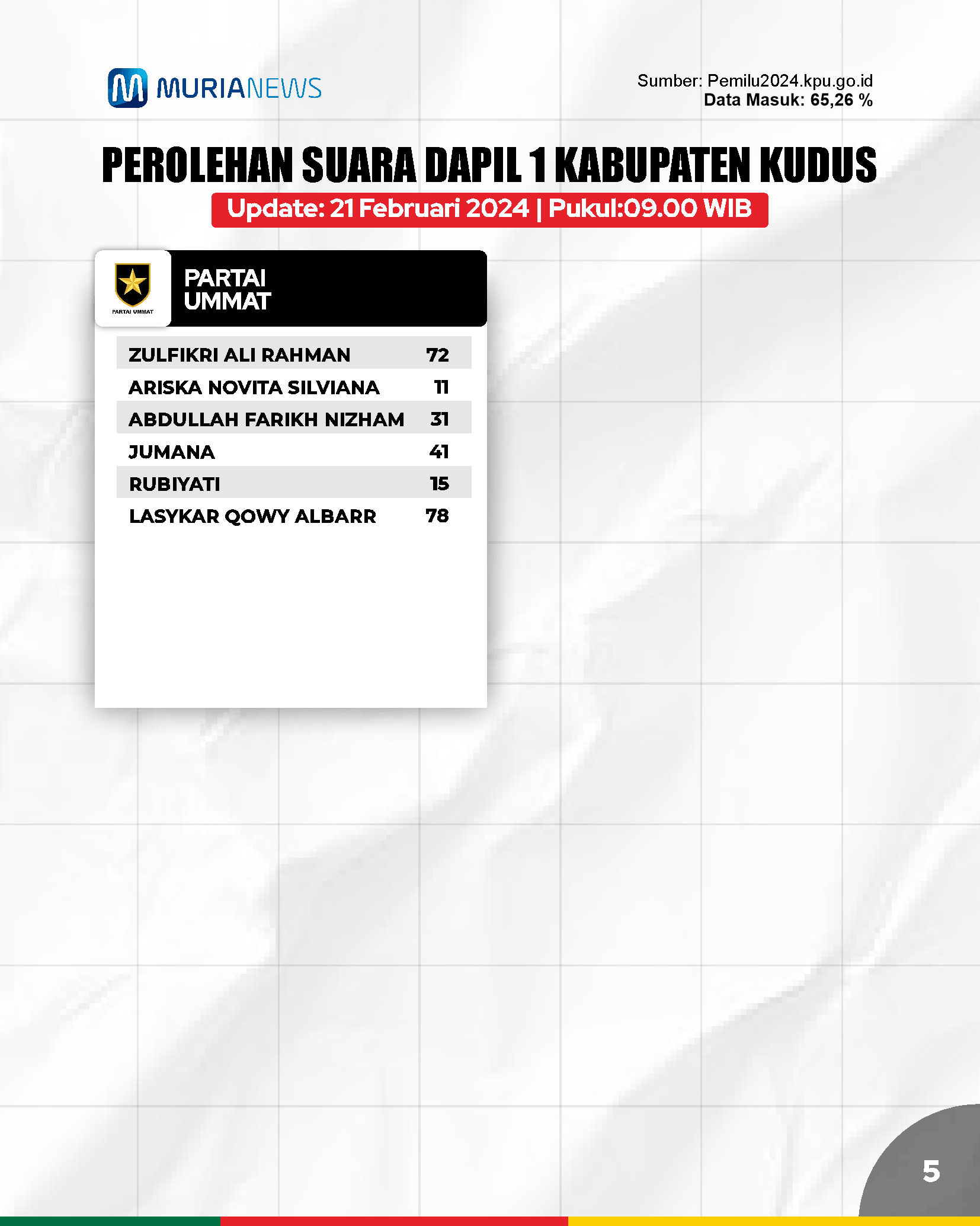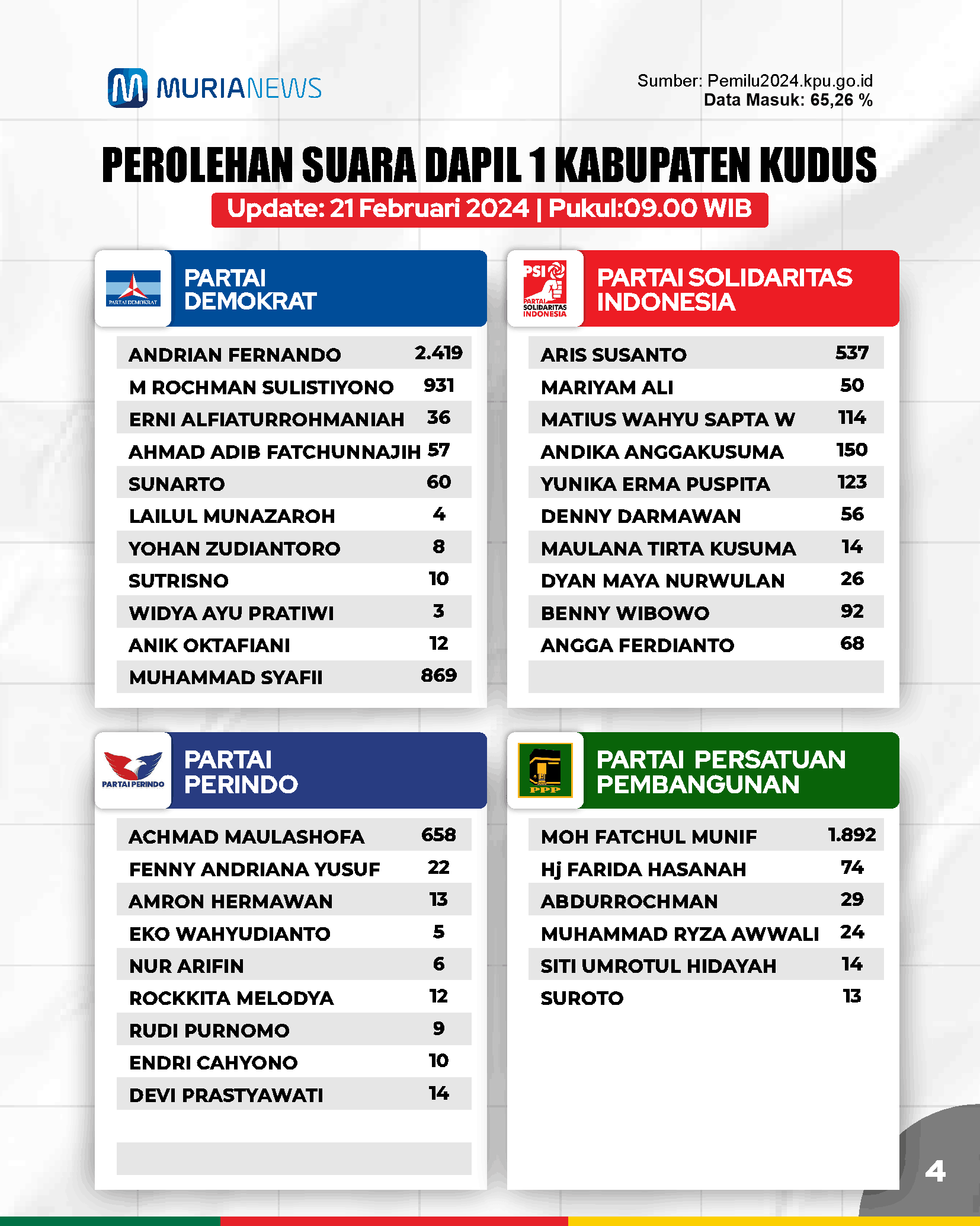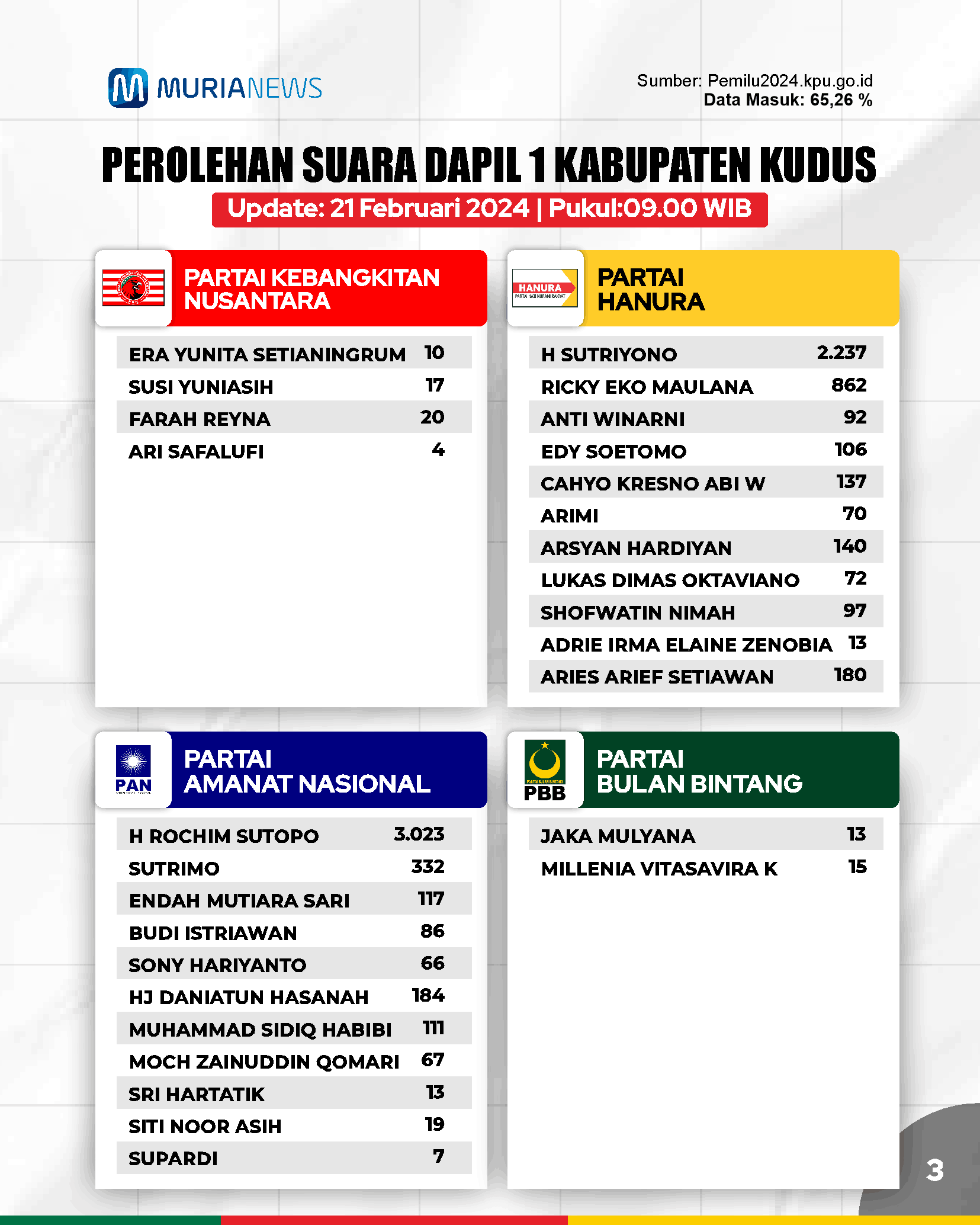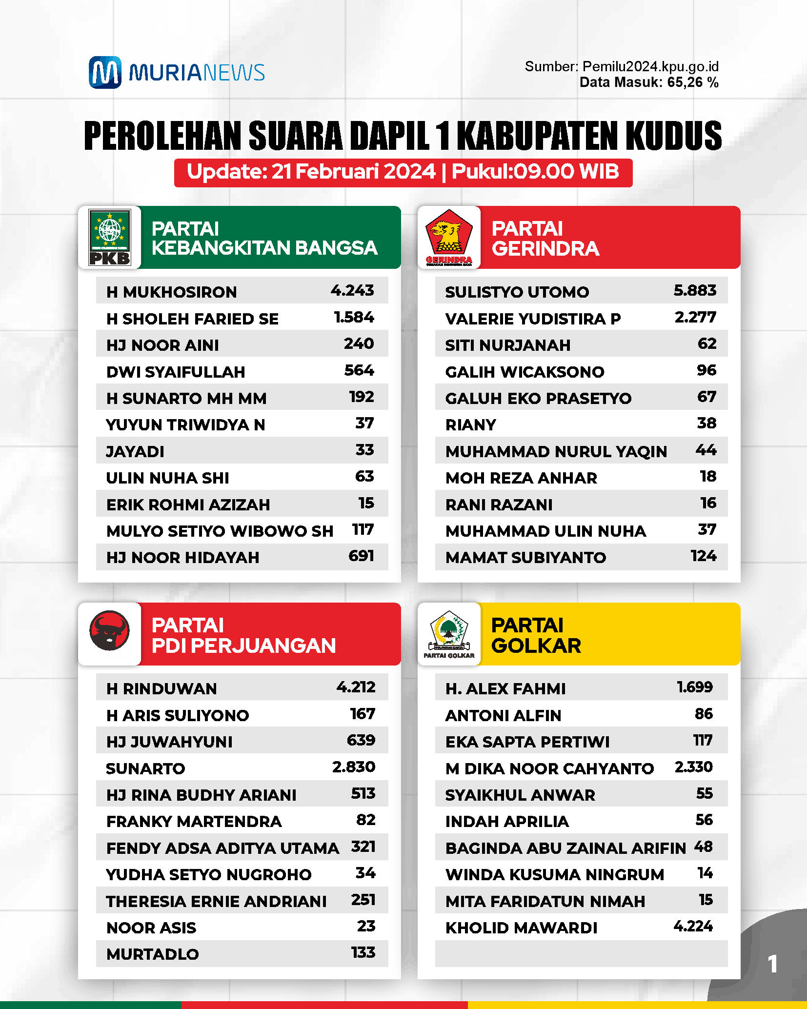 Murianews, Kudus – Komisi Pemilihan Umum (KPU) RI mengeluarkan update suara pileg DPRD Kudus melalui real count. Hingga Rabu (21/2/2024) pukul 09.00 WIB, update suara Pileg DPRD Kudus Dapil 1 sudah mencapai 65,26 persen.