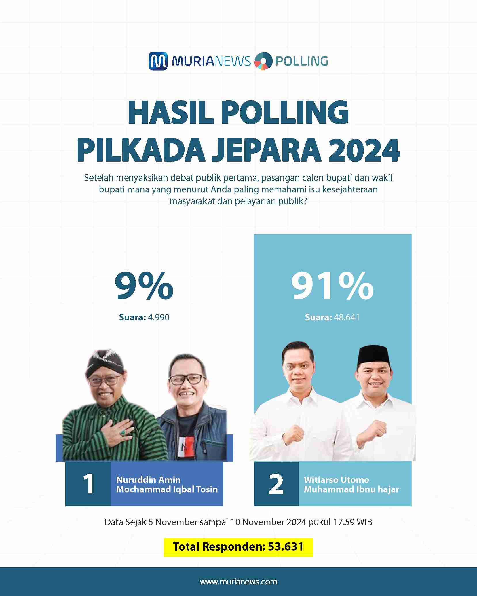Hasil polling menunjukkan sebanyak 48.641 responden, atau sekitar 91 persen, memilih pasangan Witiarso Utomo dan Ahmad Ibnu Hajar sebagai pasangan yang paling memahami isu-isu tersebut.