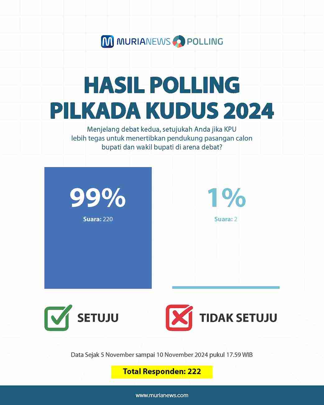 Polling itu diikuti oleh 222 responden, sebanyak 220 responden menyatakan setuju agar KPU Kudus lebih tegas menertibkan pendukung di arena debat, sementara hanya satu responden atau 1 persen yang tidak setuju.