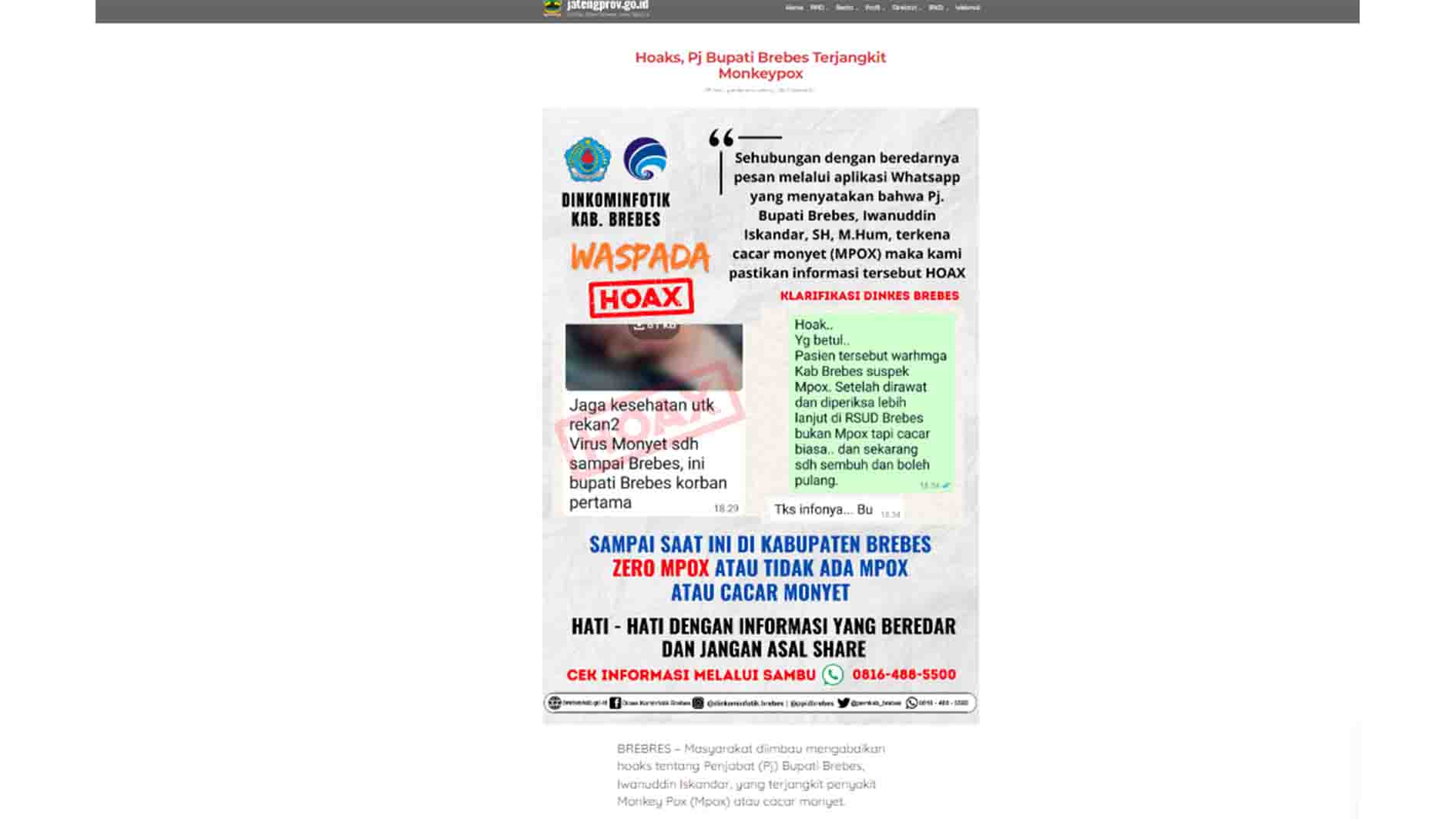 Dalam laman Pemprov Jateng, memuat artiket dengan judul: ”Hoaks, Pj Bupati Brebes Terjangkit Monkeypox”, yang diunggah pada Senin (9/9/2024).