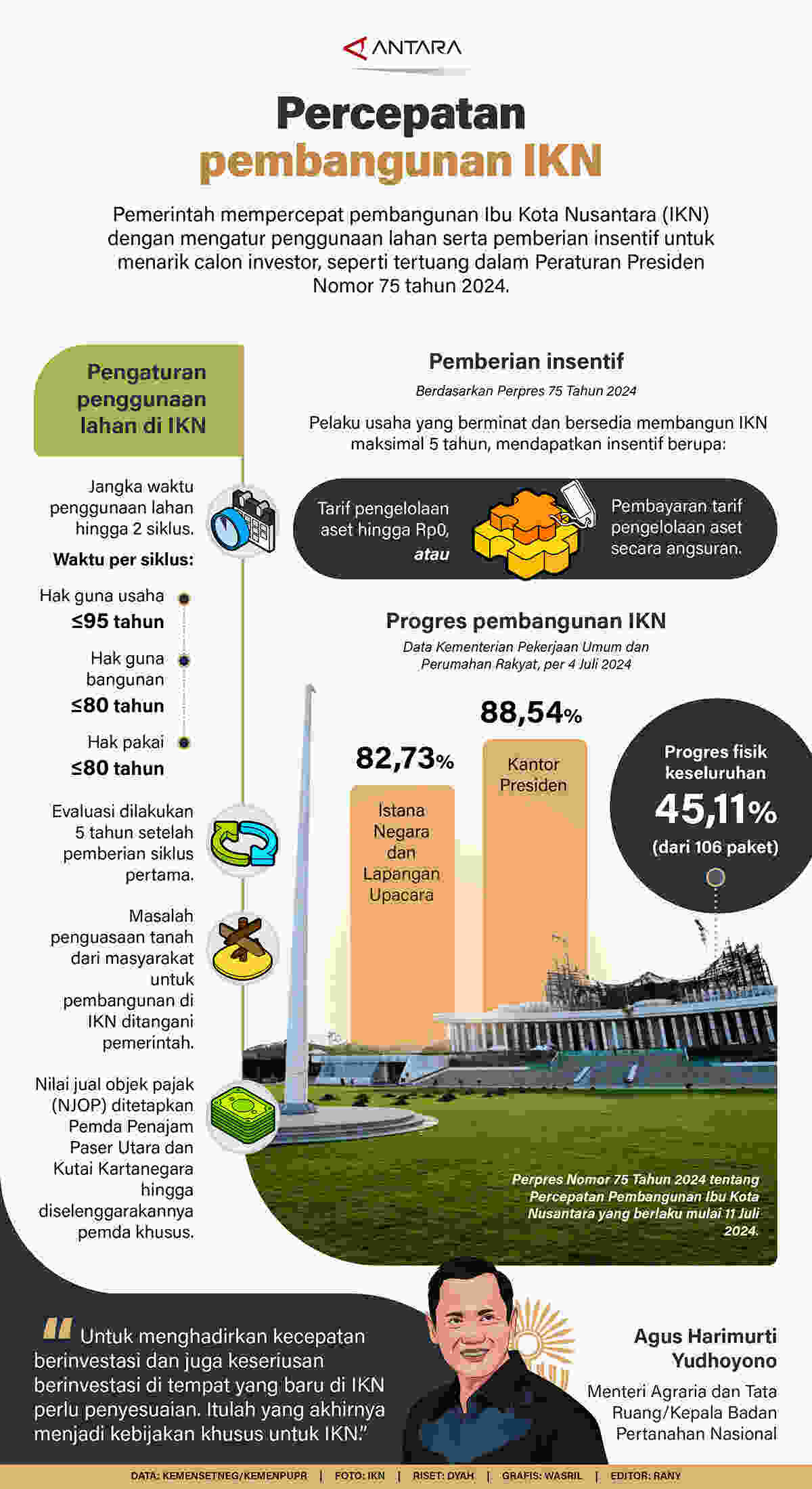 Murianews, Jakarta – Pemerintah mempercepat pembangunan Ibu Kota Nusantara (IKN) dengan mengatur penggunaan lahan serta pemberian insentif untuk menarik calon investor, seperti tertuang dalam Peraturan Presiden Nomor 75 tahun 2024.