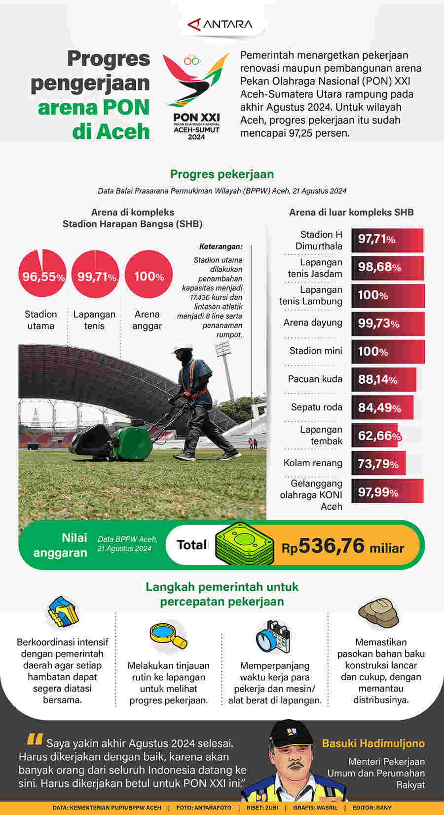 Murianews, Jakarta - Pemerintah menargetkan pekerjaan renovasi maupun pembangunan arena Pekan Olahraga Nasional (PON) XXI Aceh-Sumatera Utara rampung pada akhir Agustus 2024. Untuk wilayah Aceh, progres pekerjaan itu sudah mencapai 97,25 persen.