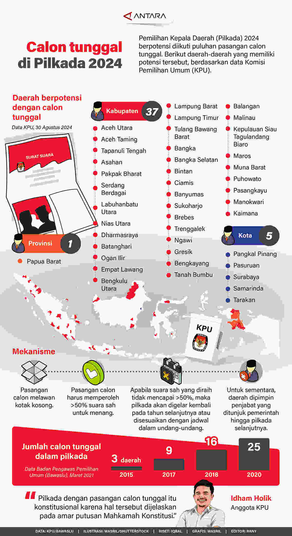 Murianews, Kudus – Pemilihan Kepala Daerah (Pilkada) 2024 berpotensi diikuti puluhan pasangan calon tunggal. Berikut daerah-daerah yang memiliki potensi tersebut, berdasarkan data Komisi Pemilihan Umum (KPU).