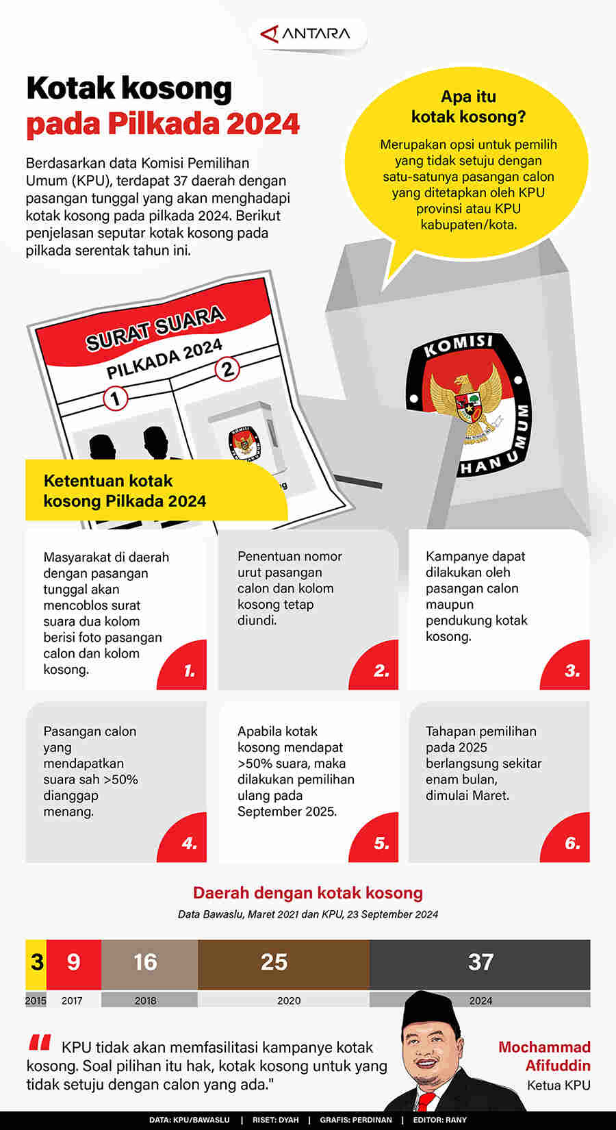Murianews, Kudus - Berdasarkan data Komisi Pemilihan Umum (KPU), terdapat 37 daerah dengan pasangan tunggal yang akan menghadapi kotak kosong pada pilkada 2024. Berikut penjelasan seputar kotak kosong pada pilkada serentak tahun ini.