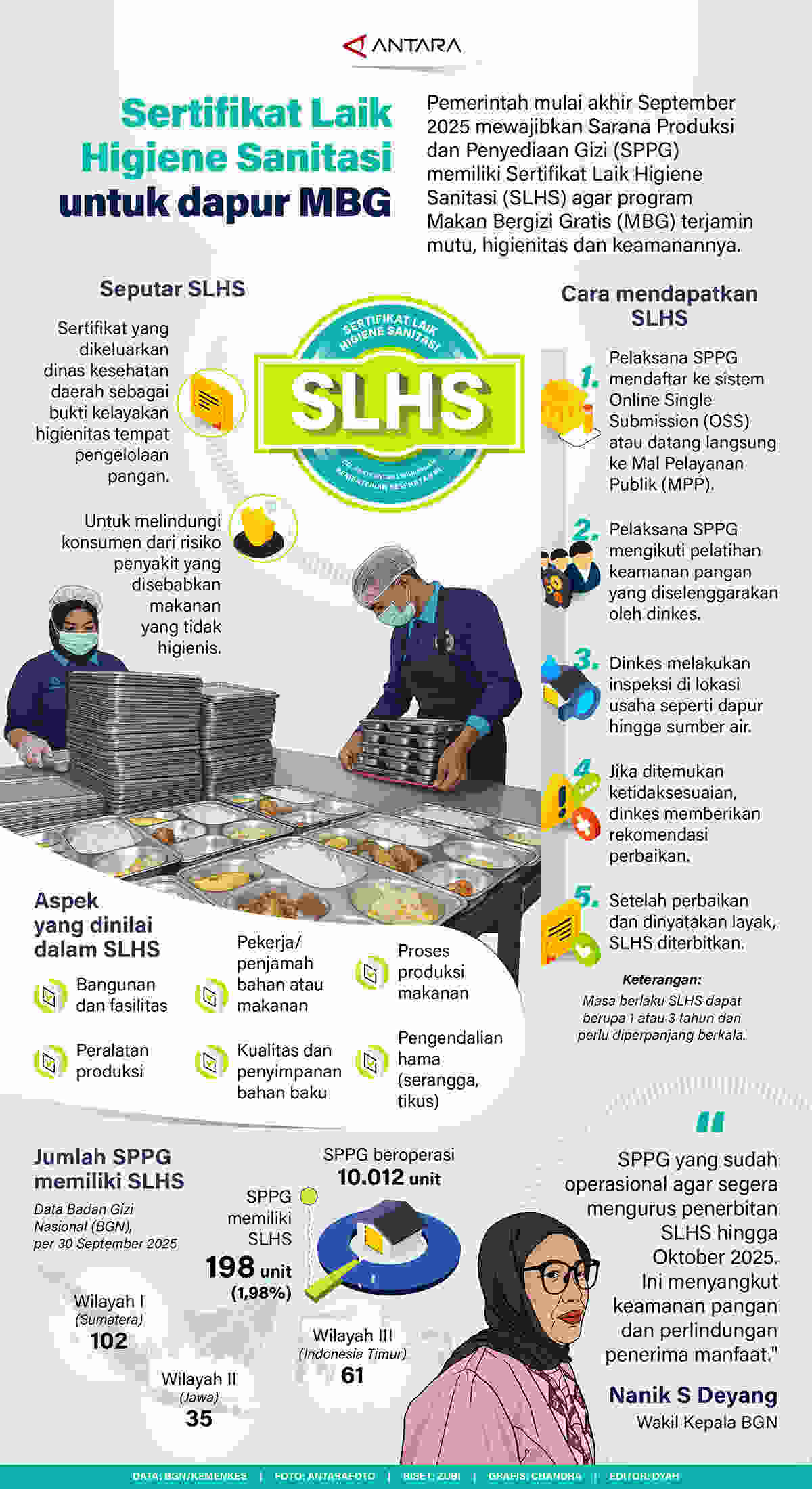Untuk mendapatkan SLHS, ada beberapa langkah yang harus dipenuhi SPPG. Setelah itu juga ada beberapa penilaian yang menjadi aspek utama tim penilai. Nah, biar kamu gak bingung, berikut grafis untuk mendapatkan SLHS yang dilansir dari ANTARA:(nad)