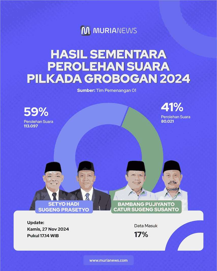 Murianews, Grobogan – Paslon nomor urut 01 Setyo Hadi-Sugeng Prasetyo mengklaim unggul dalam hitungan sementara Pilkada Grobogan 2024.