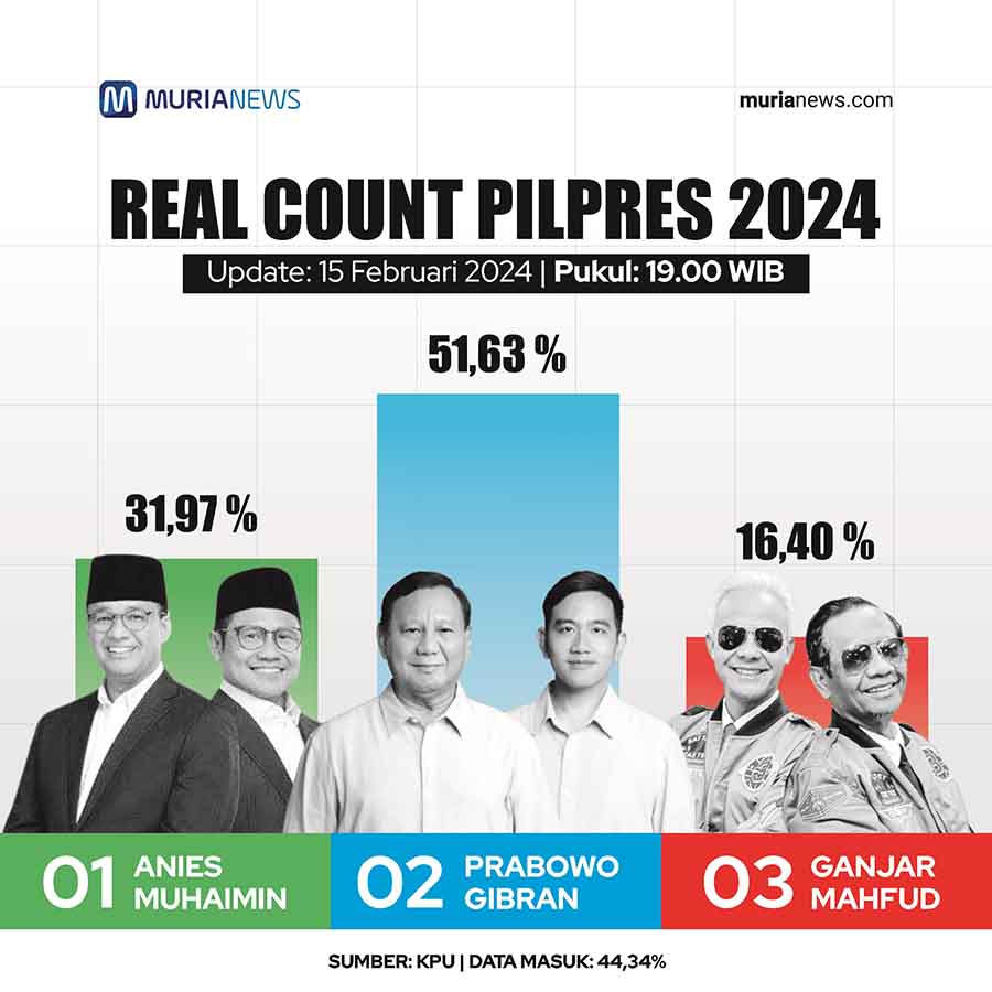 Murianews, Kudus – Komisi Pemilihan Umum (KPU) RI mengeluarkan hasil real count dari penghitungan suara Pilpres 2024. Hingga Kamis (15/2/2024) pukul 19.00 WIB, baru 44,34 persen suara yang masuk.