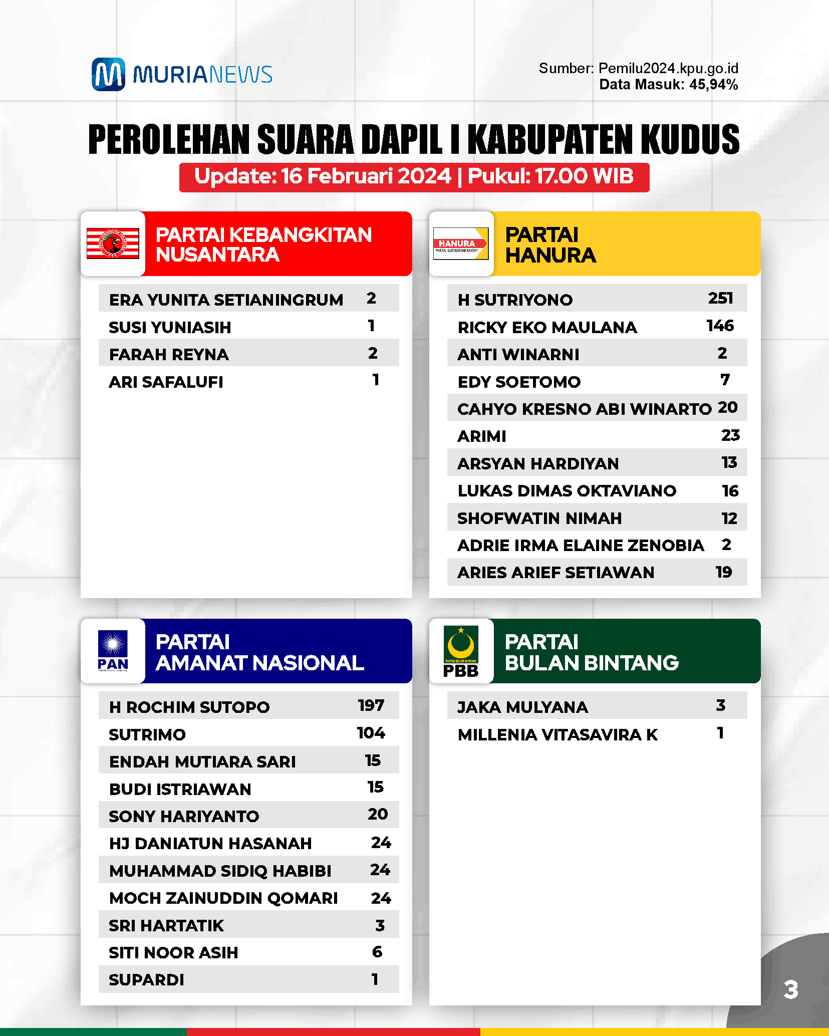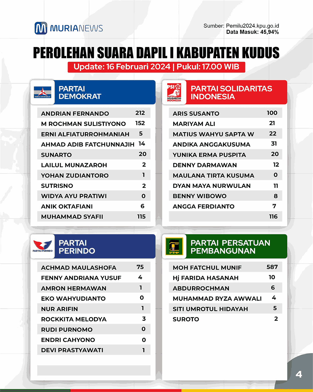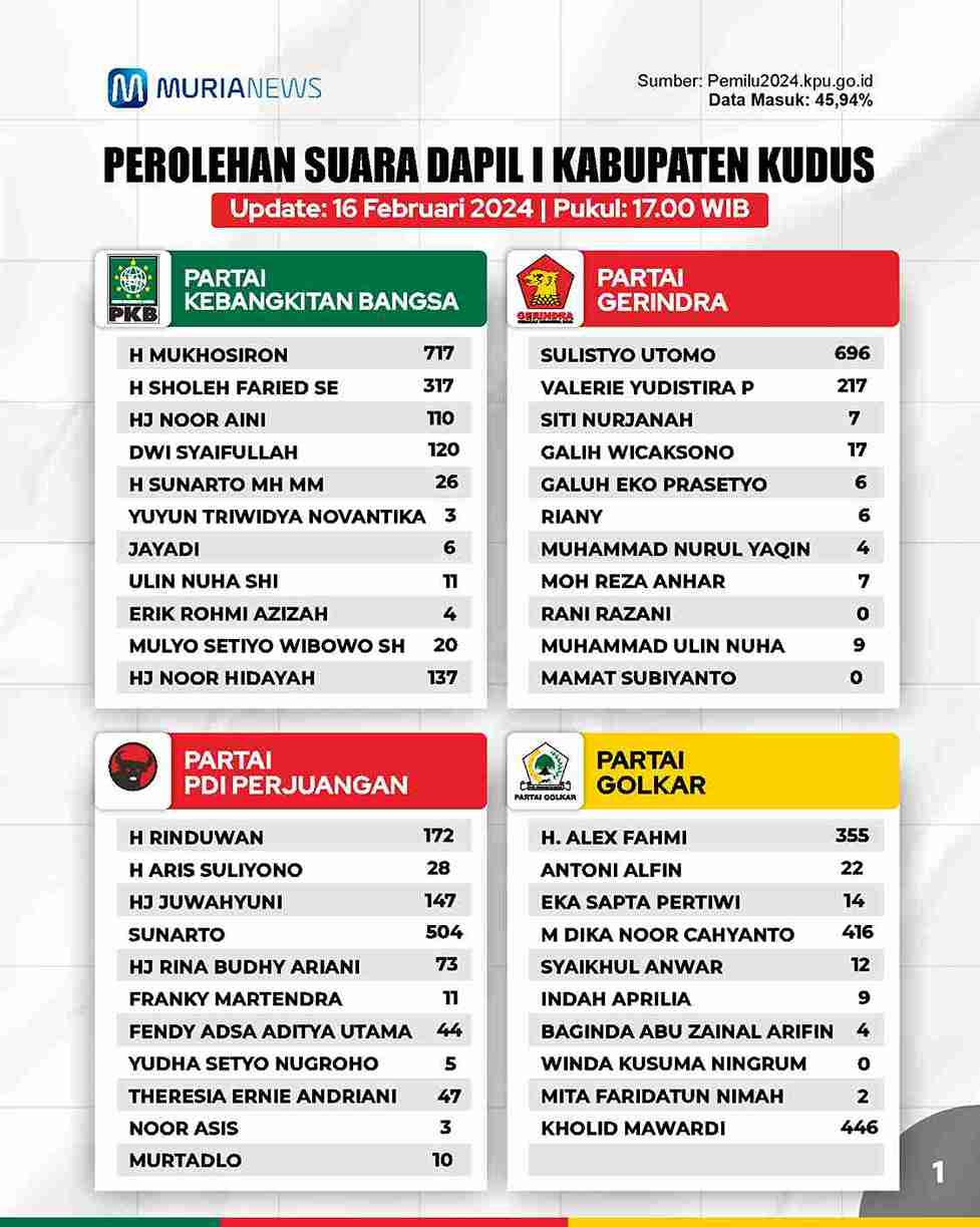 Murianews, Kudus – Komisi Pemilihan Umum (KPU) RI mengeluarkan hasil real count penghitungan suara Pileg 2024. Hingga Jumat (16/2/2024) pukul 19.30 WIB, Pileg Kudus 2024 update untuk dapil 1 sudah mencapai 45,95 persen.