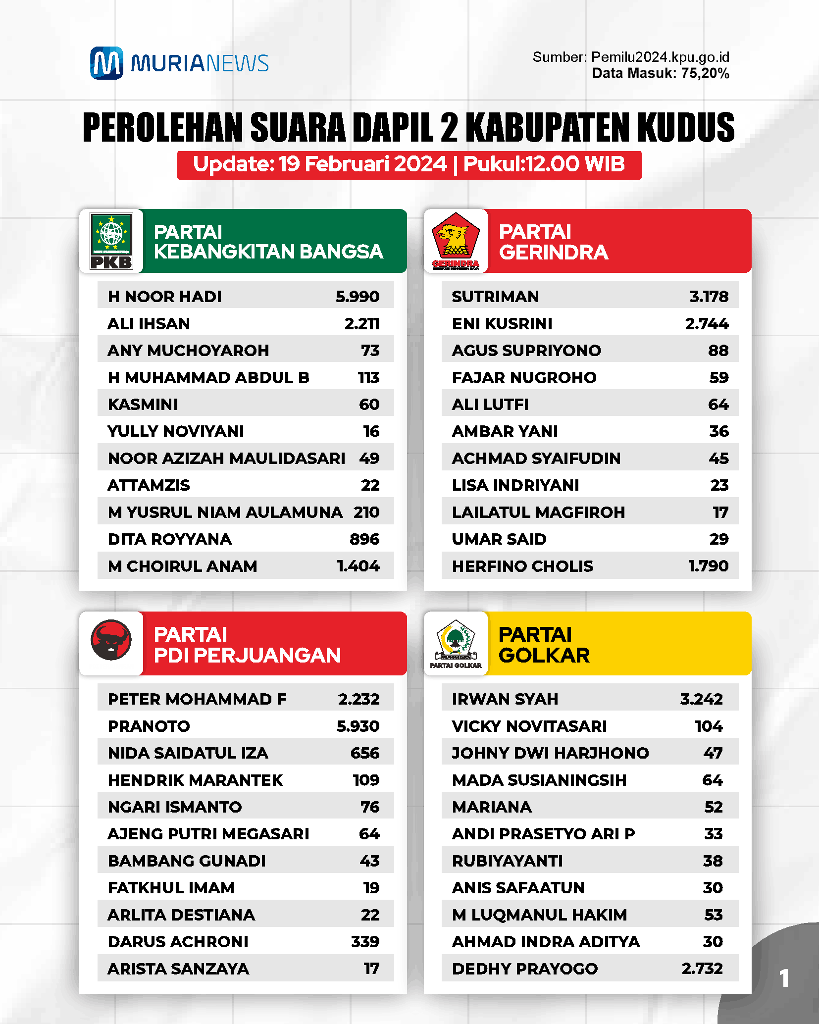 Update Suara Pileg Kudus Dapil 2, 19 Februari Pukul 13.30