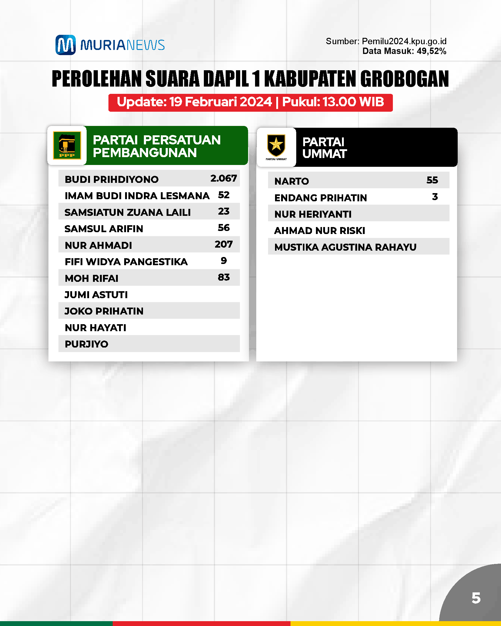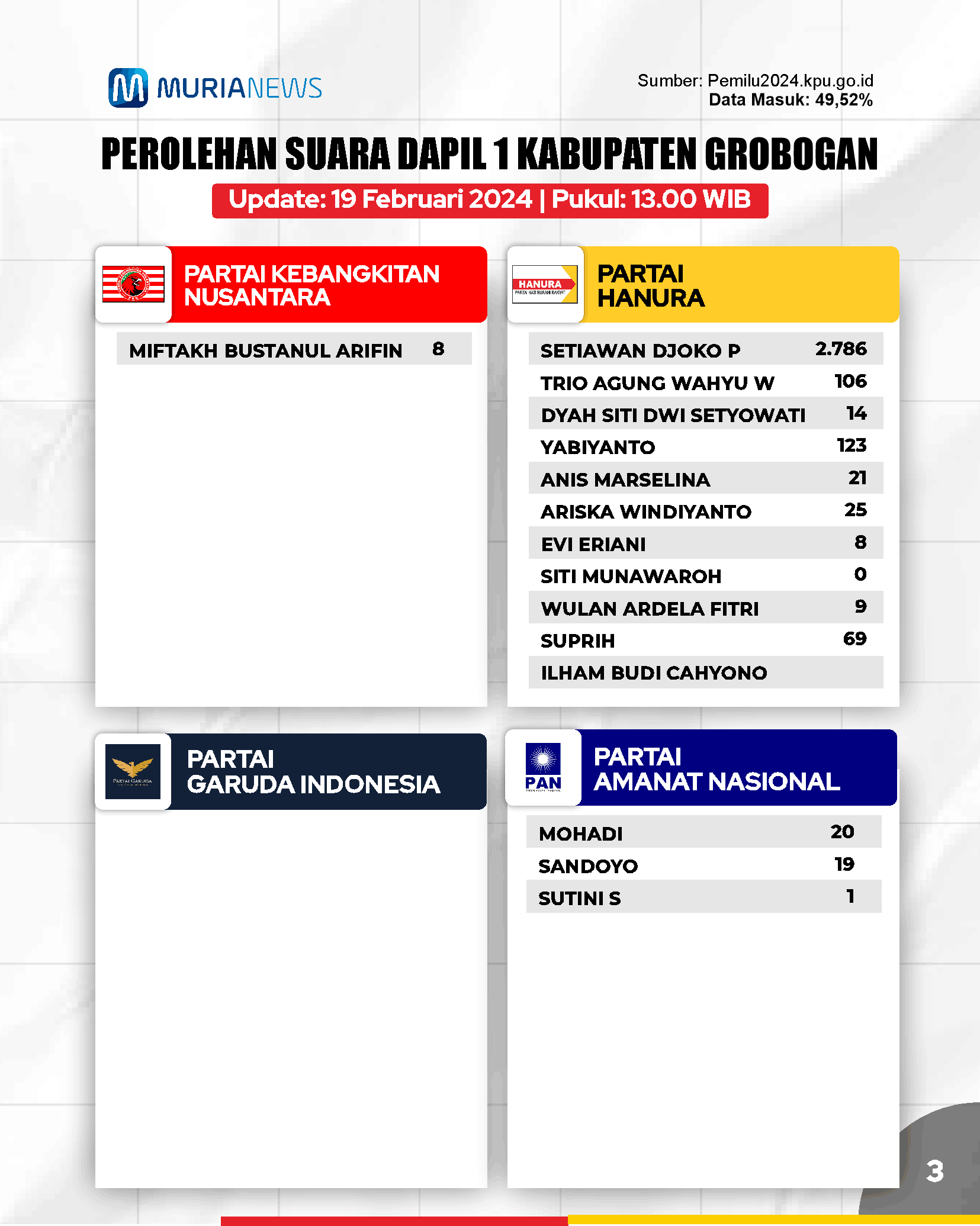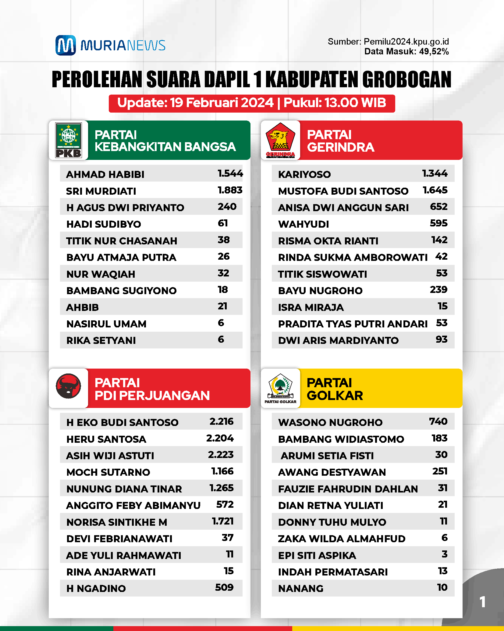 Murianews, Grobogan – Komisi Pemilihan Umum (KPU) RI mengeluarkan update suara Pileg Grobogan melalui real count penghitungan suara Pileg 2024. Hingga Senin (19/2/2024) pukul 14.30 WIB, update suara Pileg Grobogan 2024 untuk Dapil 1 Grobogan sudah mencapai 49,52 persen.