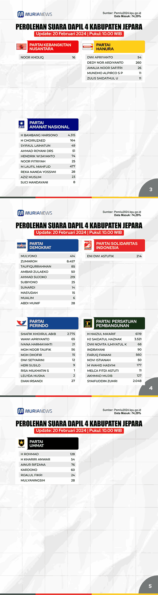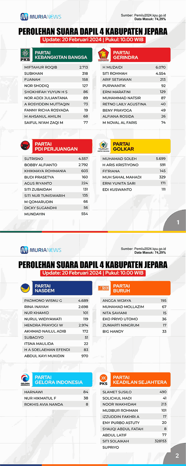 Murianews, Jepara – Komisi Pemilihan Umum (KPU) RI mengeluarkan update suara pileg DPRD Jepara melalui real count. Hingga Selasa (20/2/2024) pukul 10.00 WIB, update suara Pileg DPRD Jepara Dapil 4 sudah mencapai 74,29 persen.