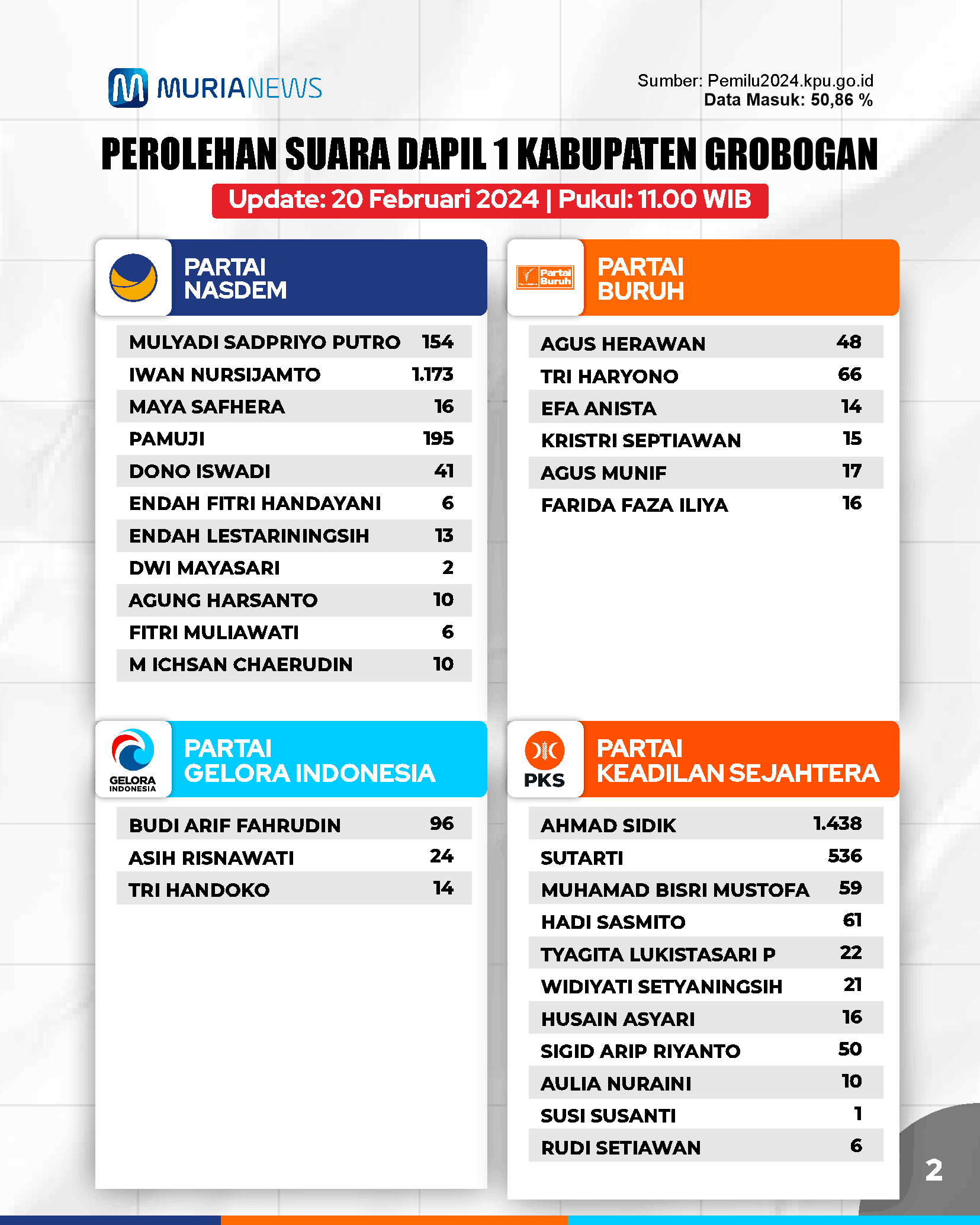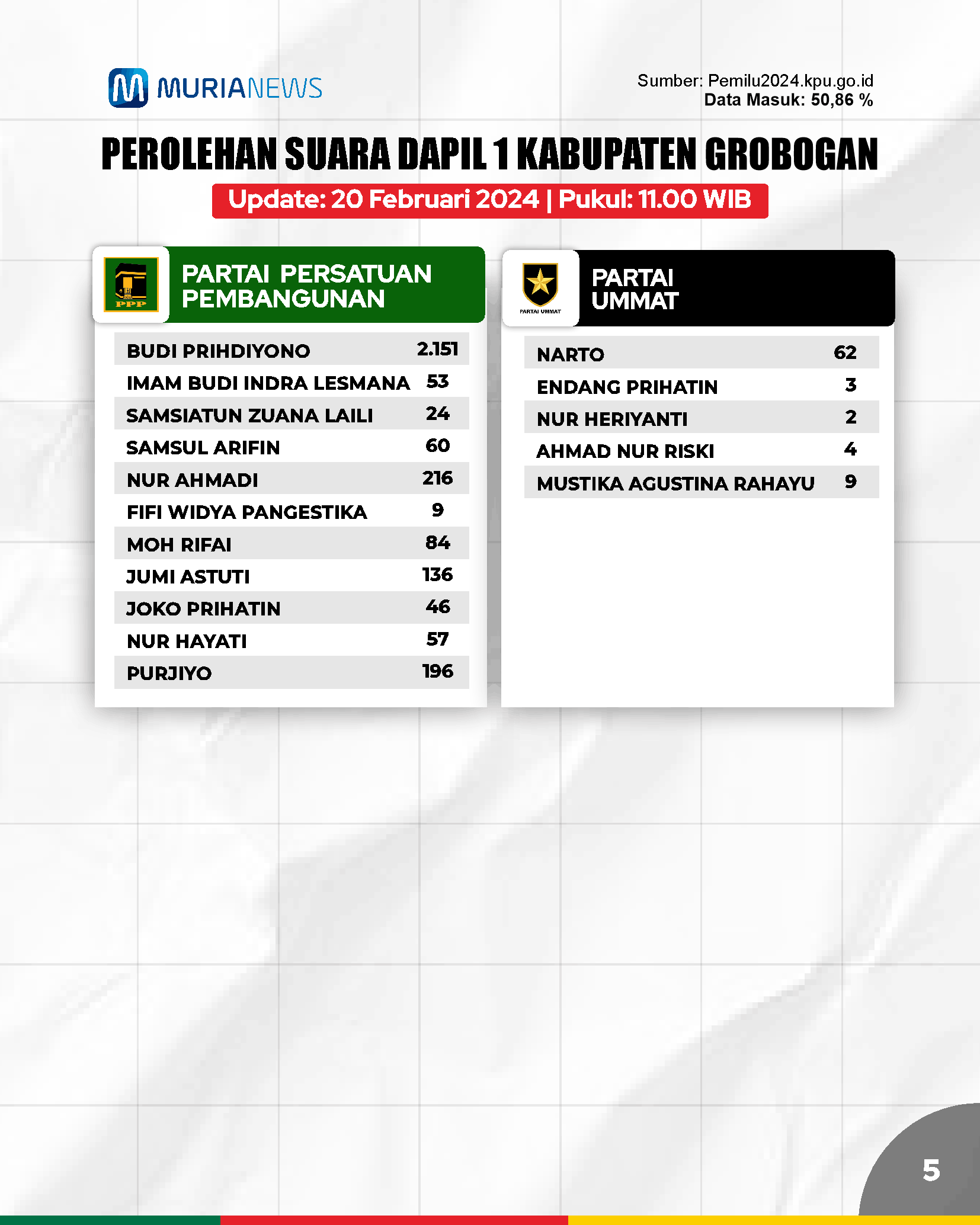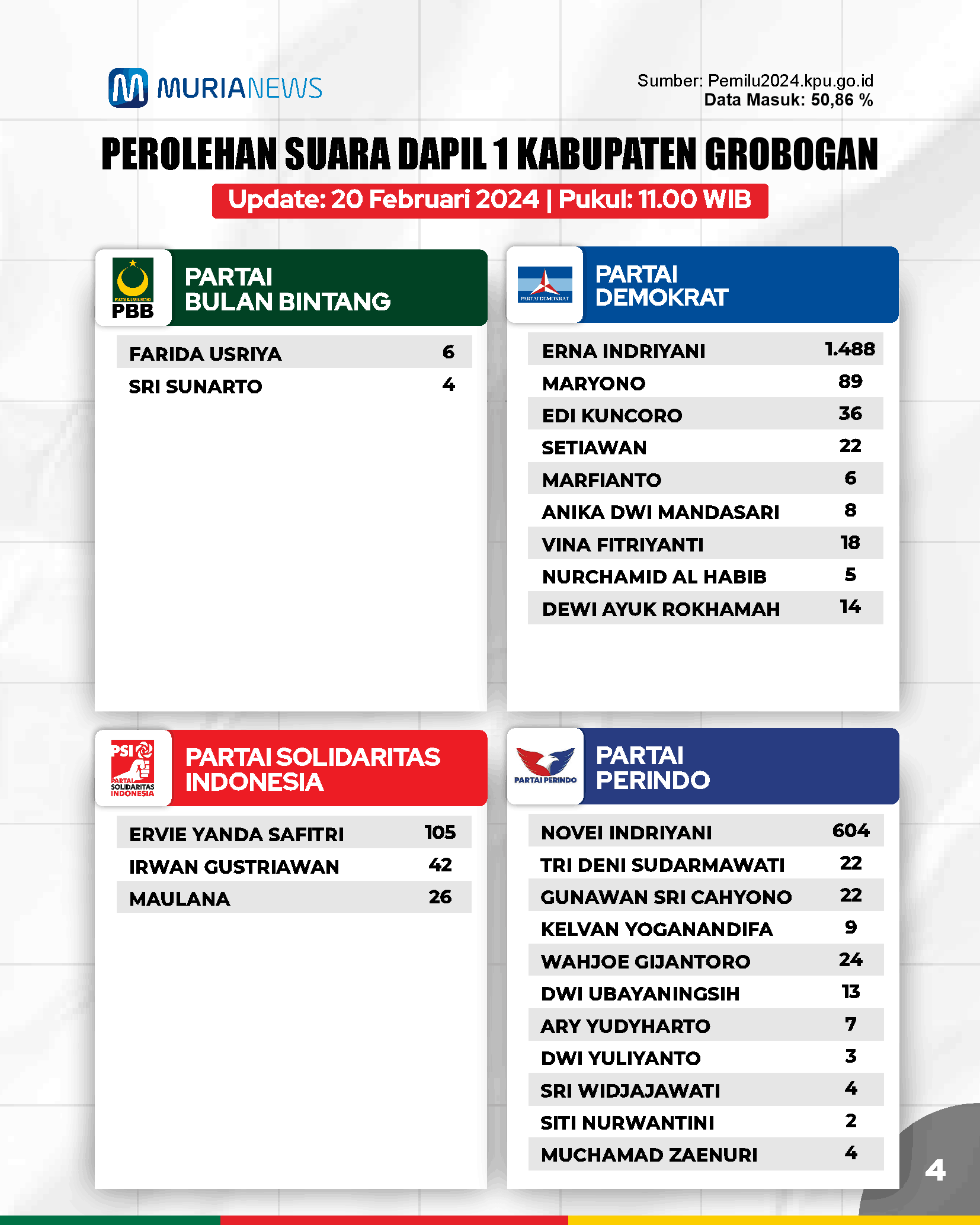 Murianews, Grobogan – Komisi Pemilihan Umum (KPU) RI mengeluarkan update suara pileg DPRD Grobogan melalui real count. Hingga Selasa (20/2/2024) pukul 11.00 WIB, update suara Pileg DPRD Grobogan Dapil 1 sudah mencapai 50,86 persen.