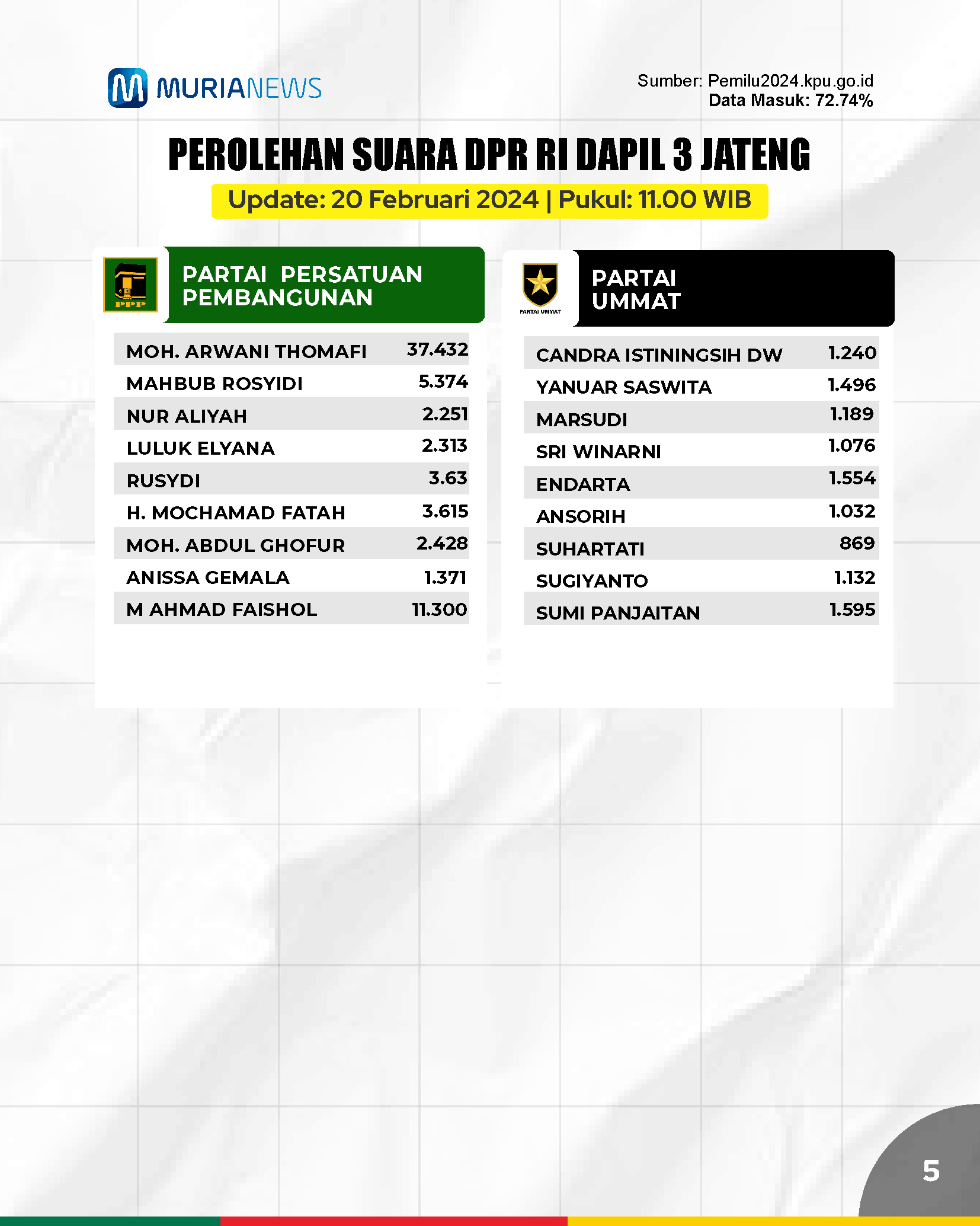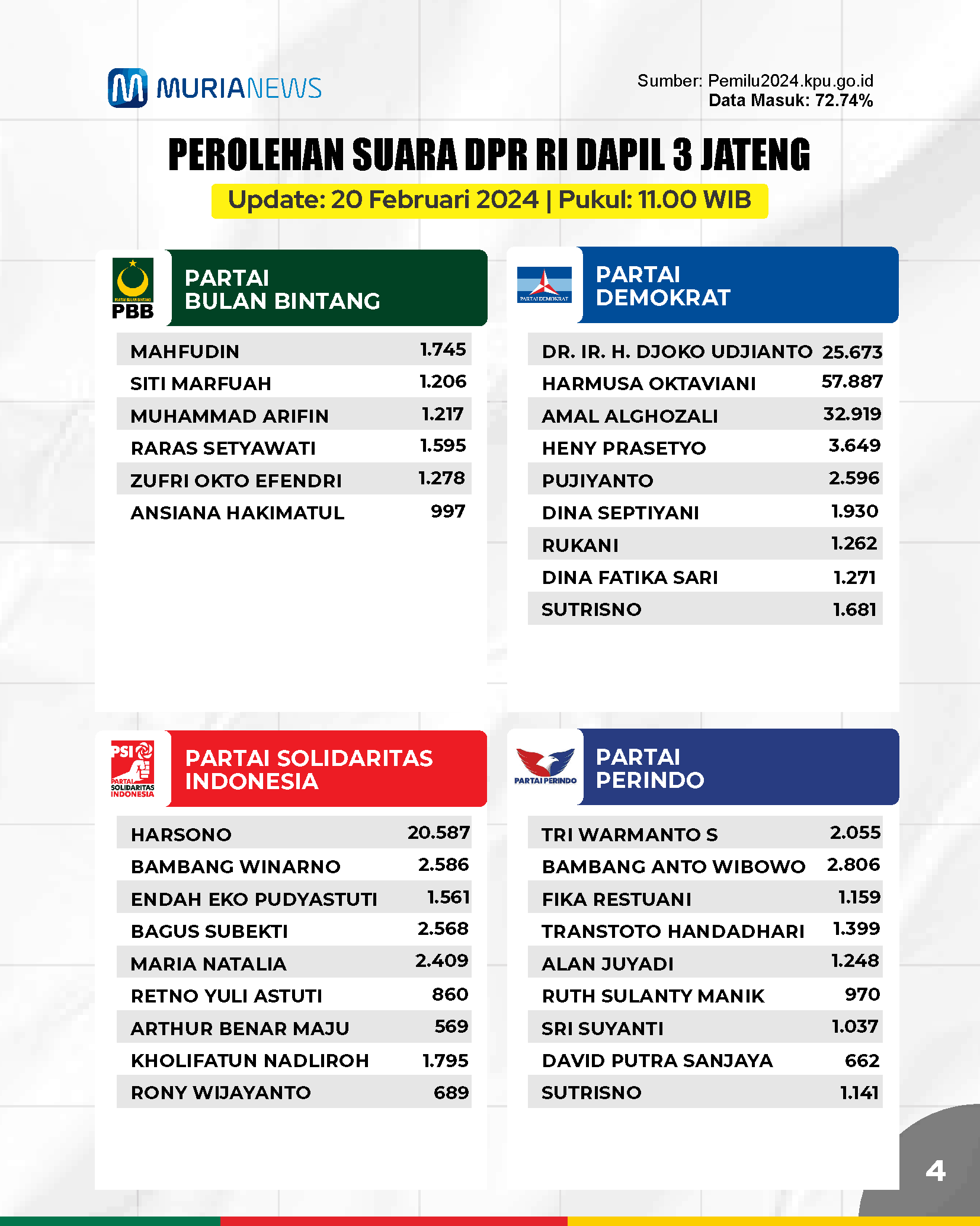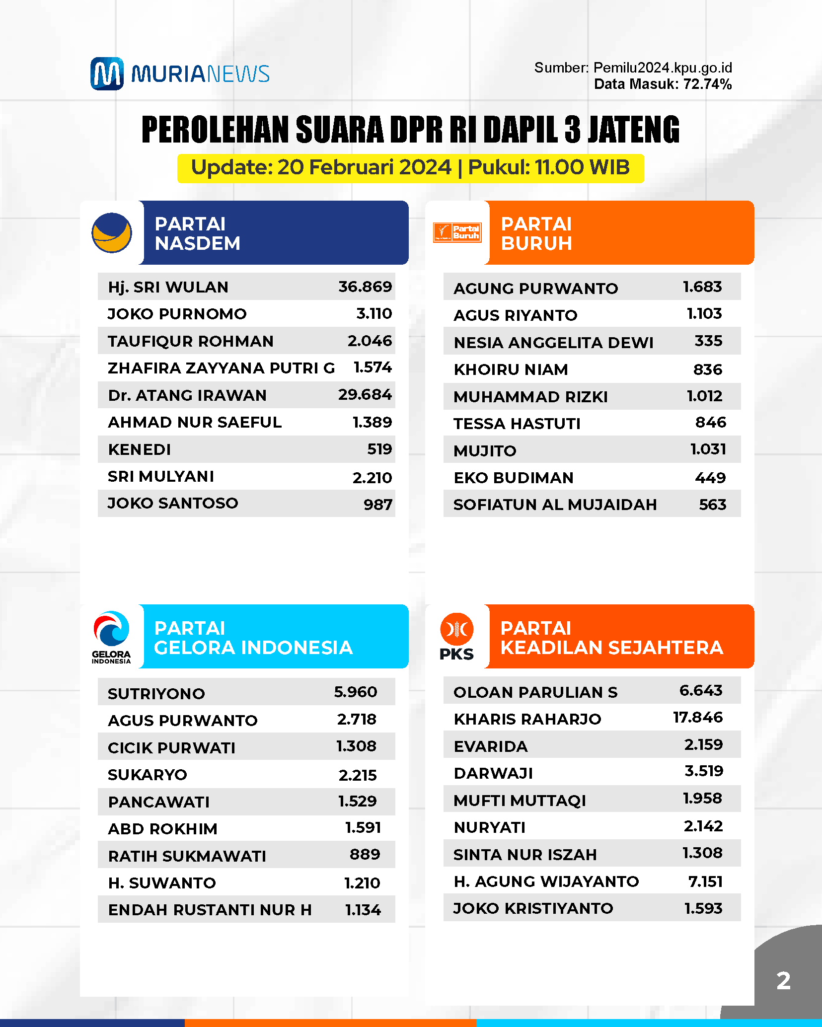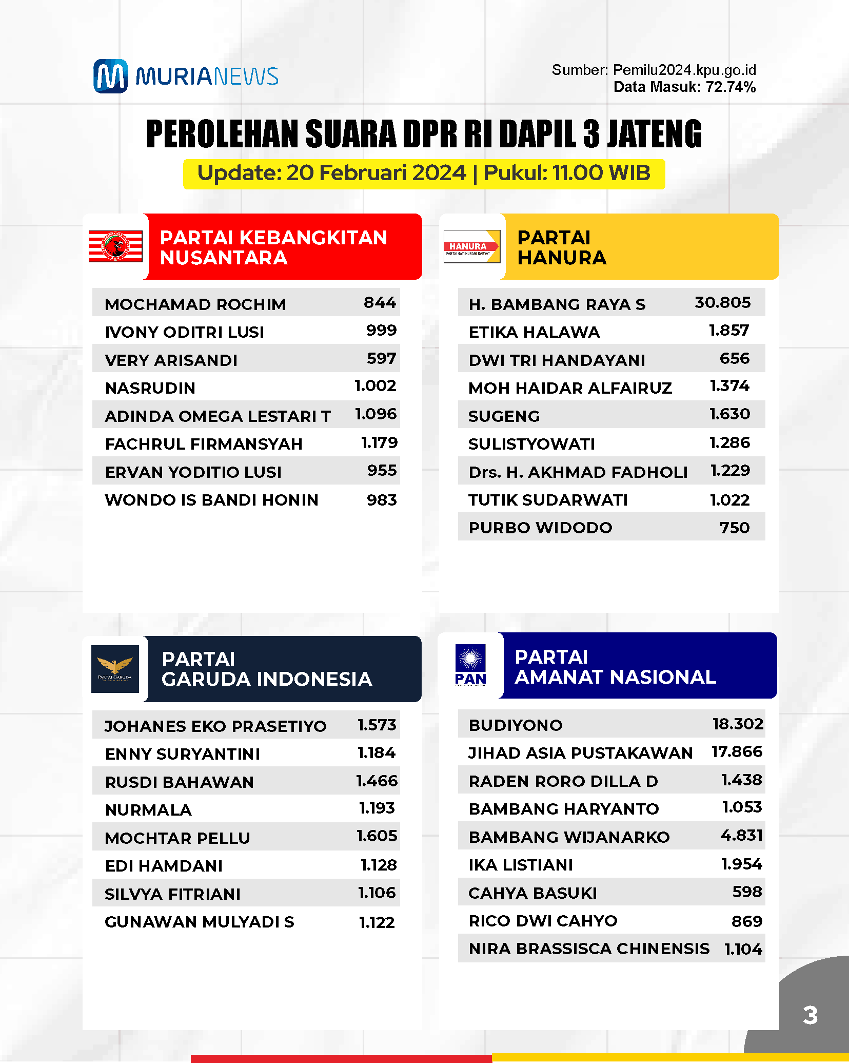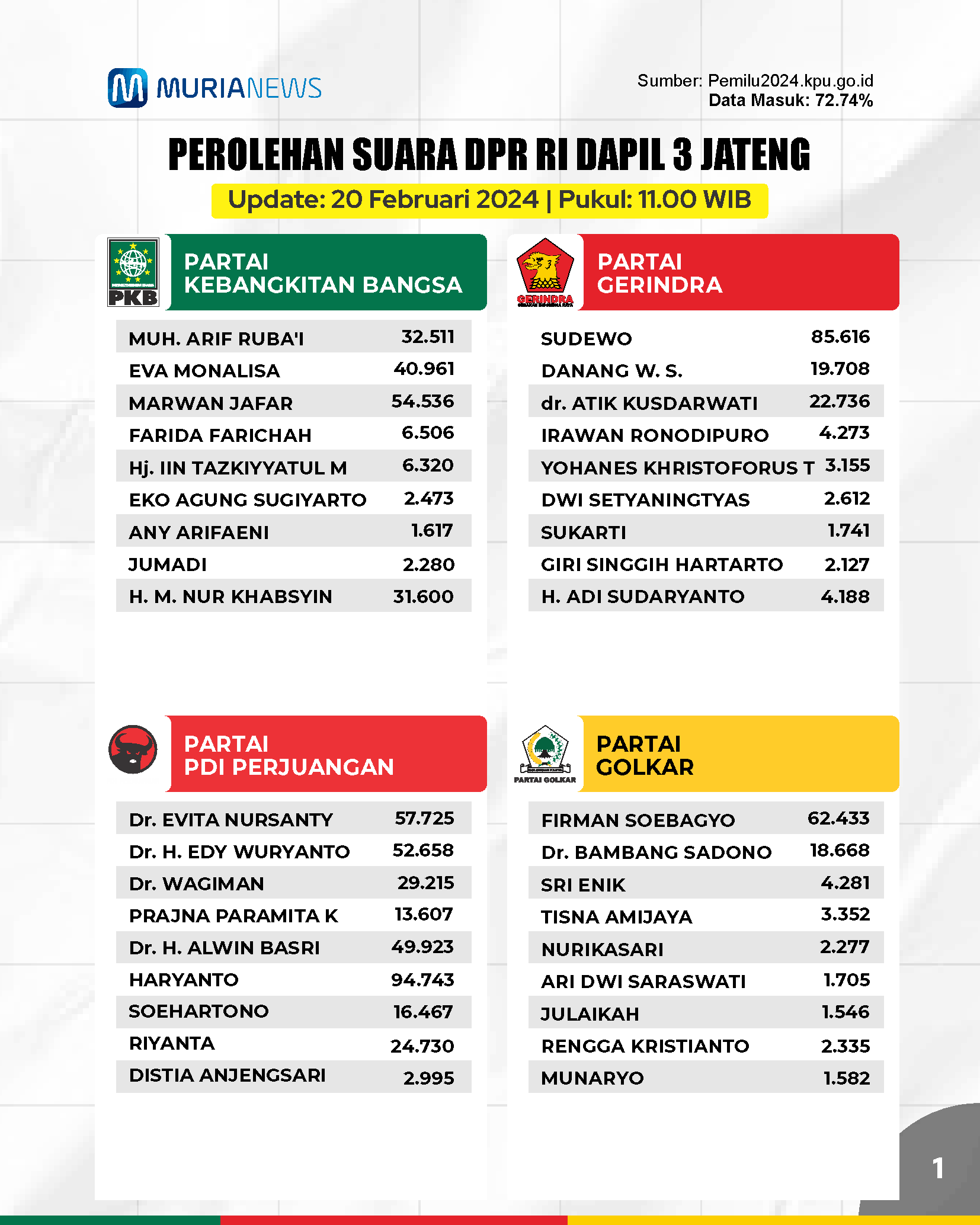 Update Suara Pileg DPR RI Dapil Jateng 3 Tanggal 20 Februari