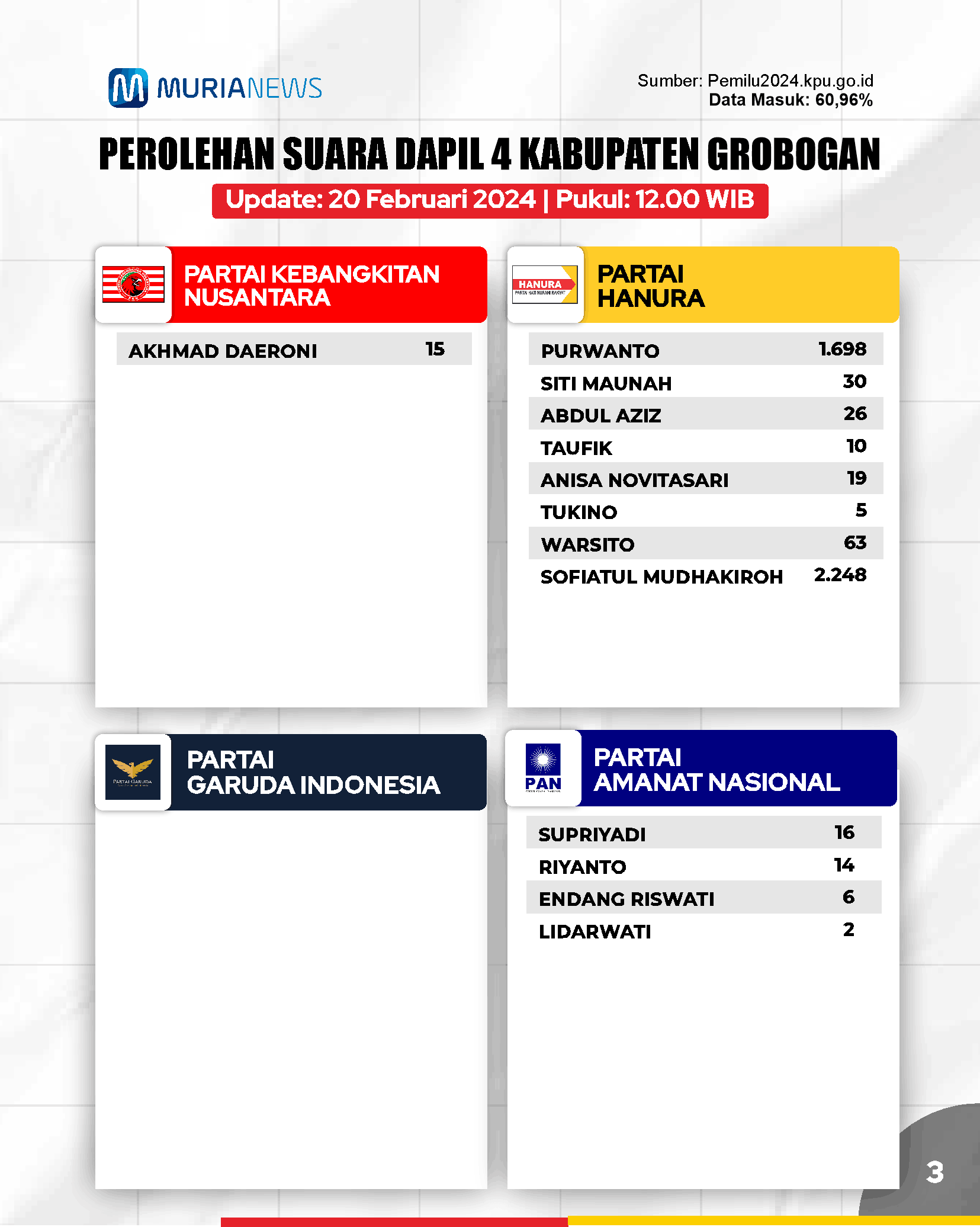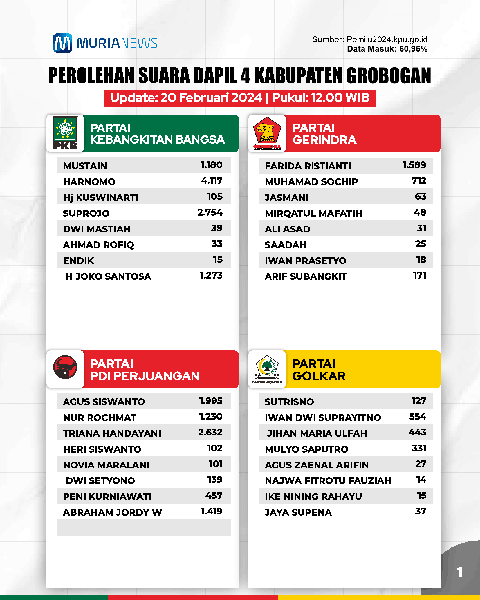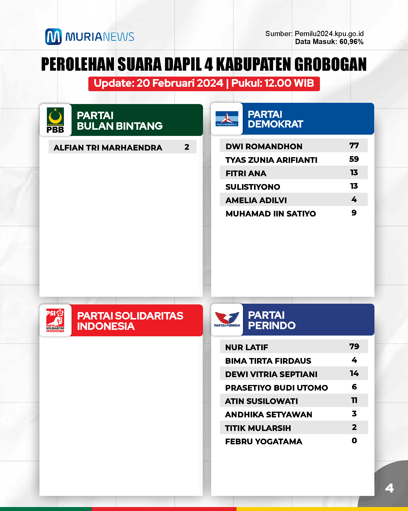 Murianews, Grobogan – Komisi Pemilihan Umum (KPU) RI mengeluarkan update suara pileg DPRD Grobogan melalui real count. Hingga Selasa (20/2/2024) pukul 12.00 WIB, update suara Pileg DPRD Grobogan Dapil 4 sudah mencapai 60,96 persen.