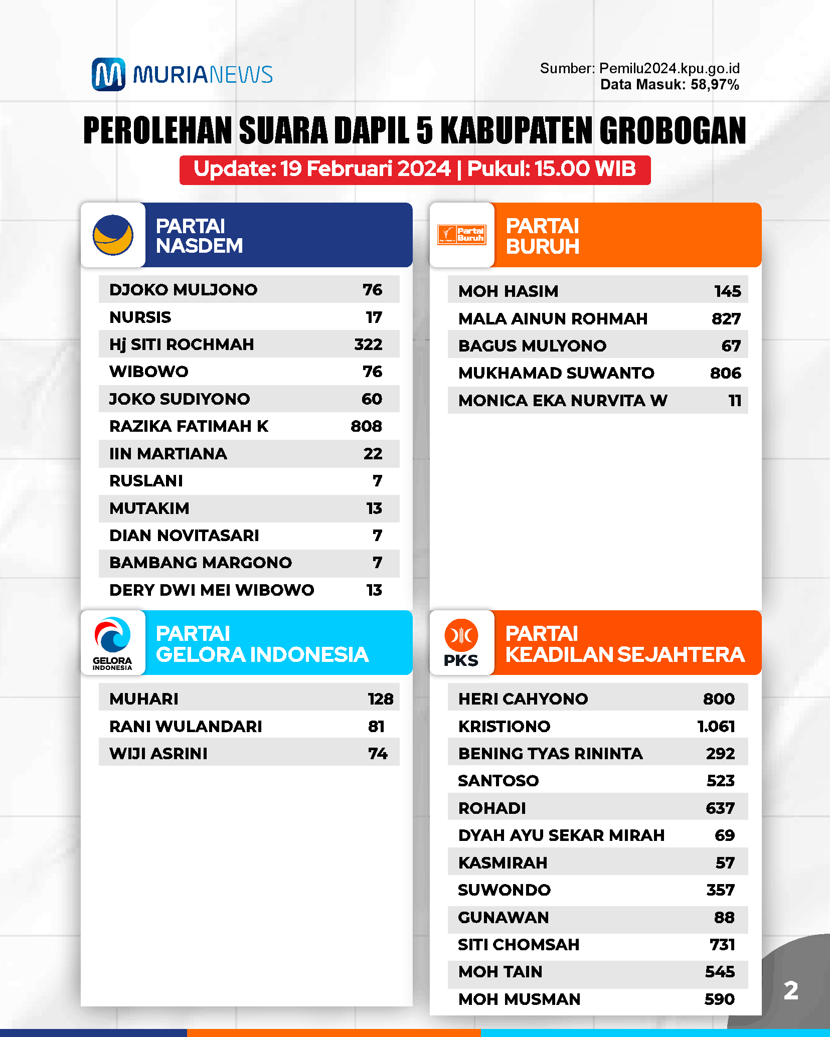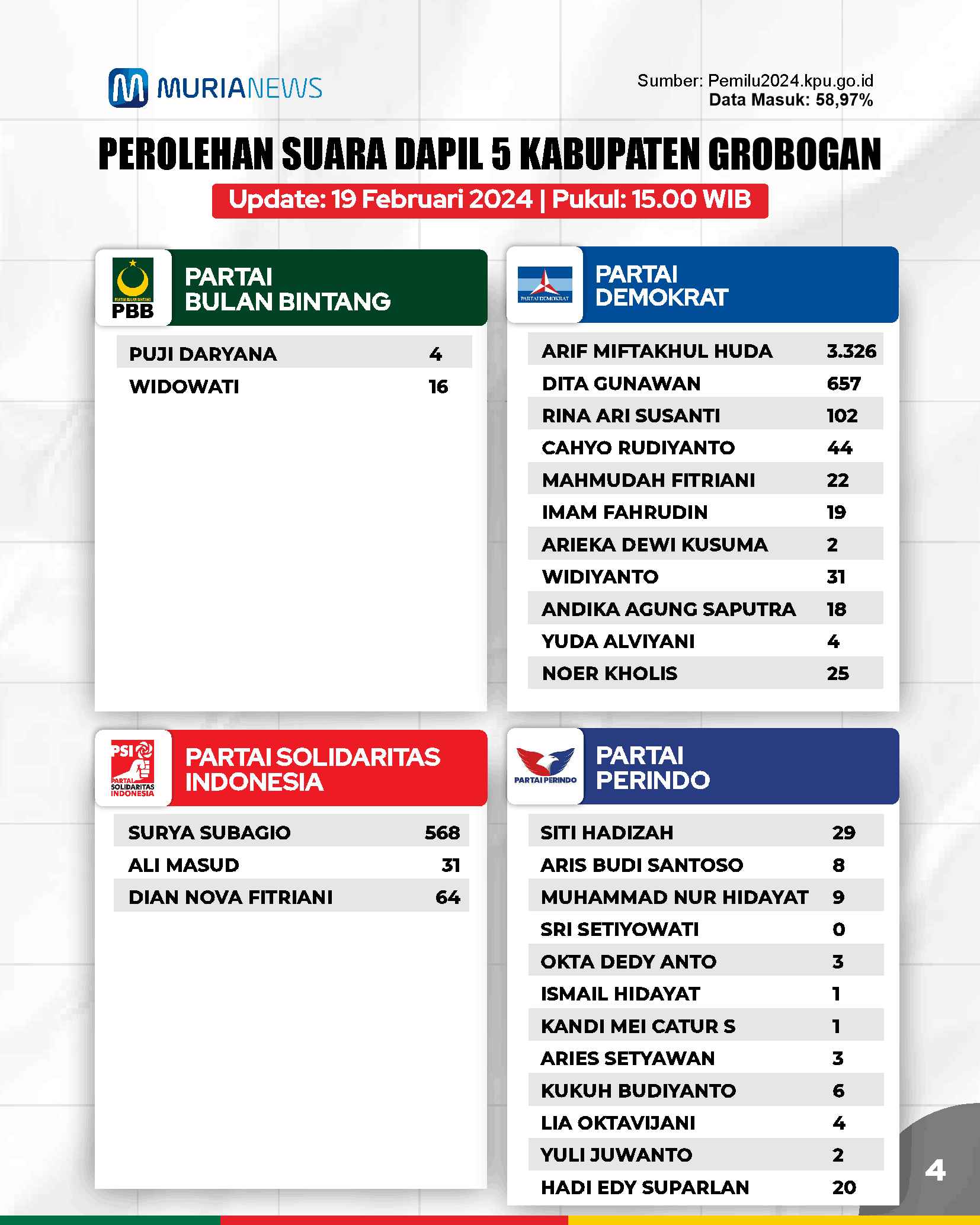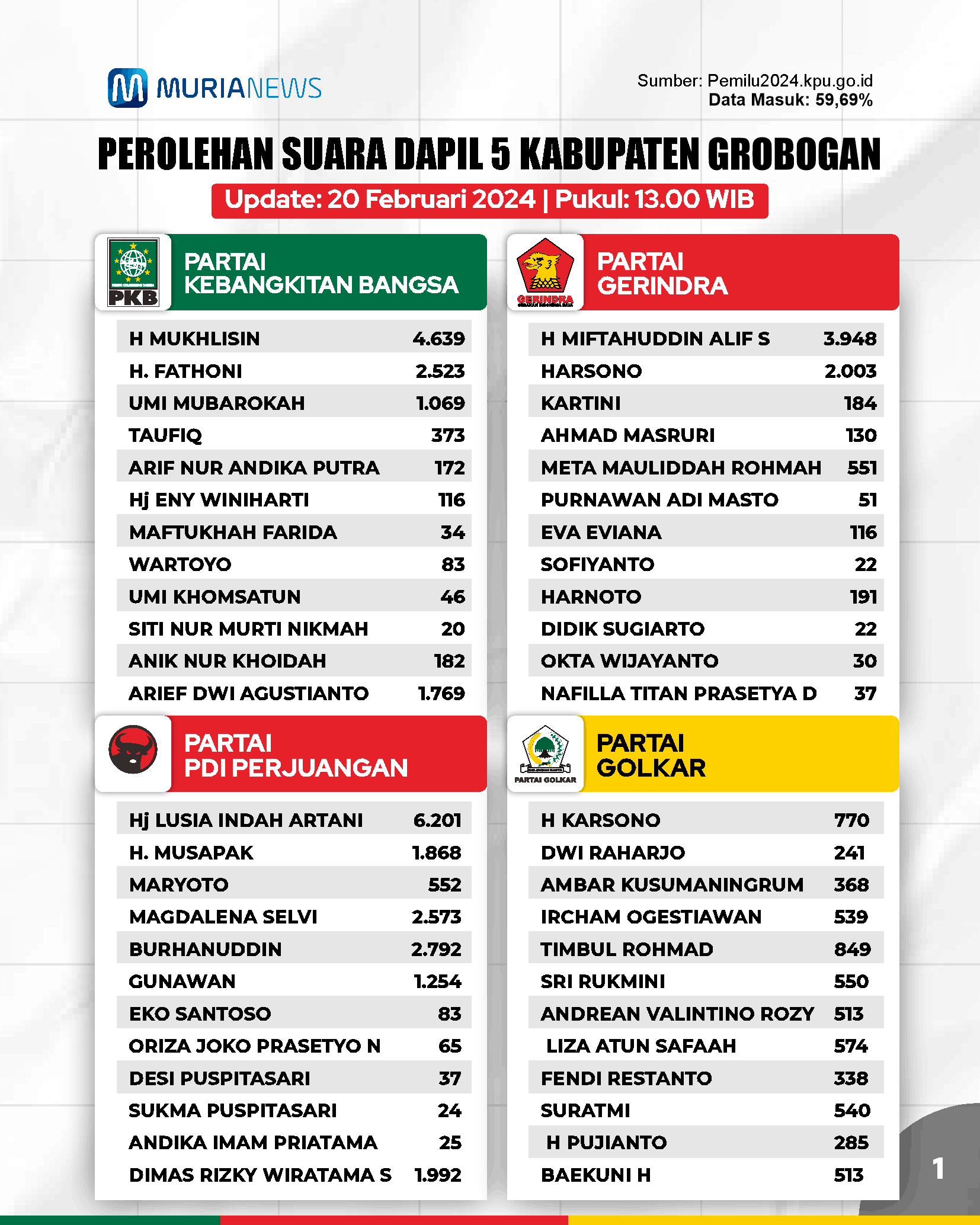 Murianews, Grobogan – Komisi Pemilihan Umum (KPU) RI mengeluarkan update suara pileg DPRD Grobogan melalui real count. Hingga Selasa (20/2/2024) pukul 13.00 WIB, update suara Pileg DPRD Grobogan Dapil 5 sudah mencapai 59,69 persen.