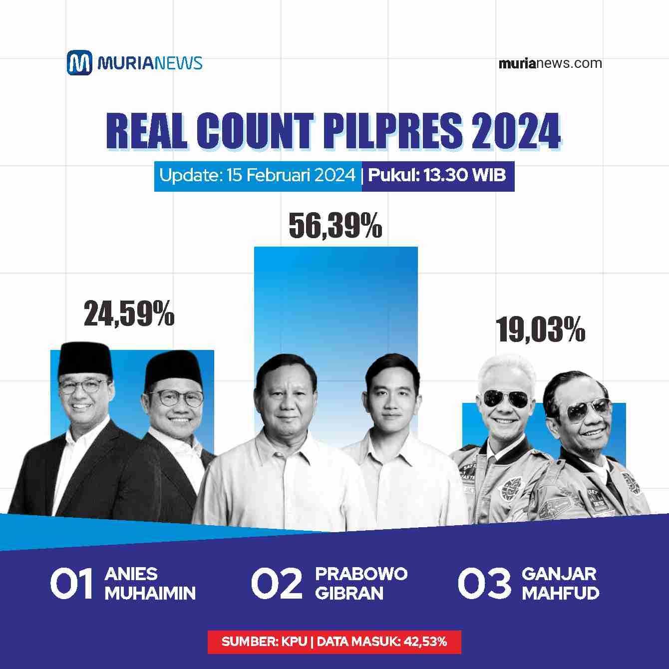 Murianews, Kudus – Komisi Pemilihan Umum (KPU) RI mengeluarkan hasil real count dari penghitungan suara Pilpres 2024. Hingga Kamis (15/2/2024) pukul 13.30 WIB, baru 42,53 persen suara yang masuk.