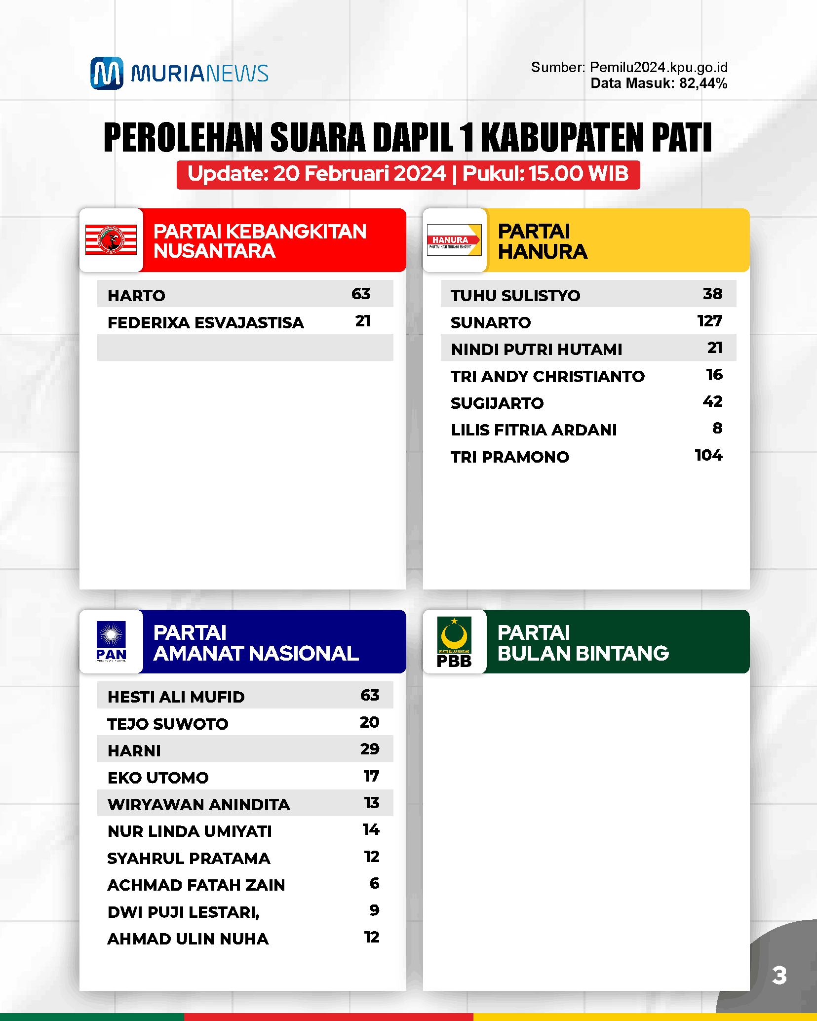 Murianews, Pati - Komisi Pemilihan Umum (KPU) RI mengeluarkan update suara Pileg Pati melalui real count penghitungan suara Pileg 2024. Hingga Selasa (20/2/2024) pukul 15.00 WIB, update suara Pileg Pati 2024 untuk Dapil 1 Pati sudah mencapai 82,44 persen.