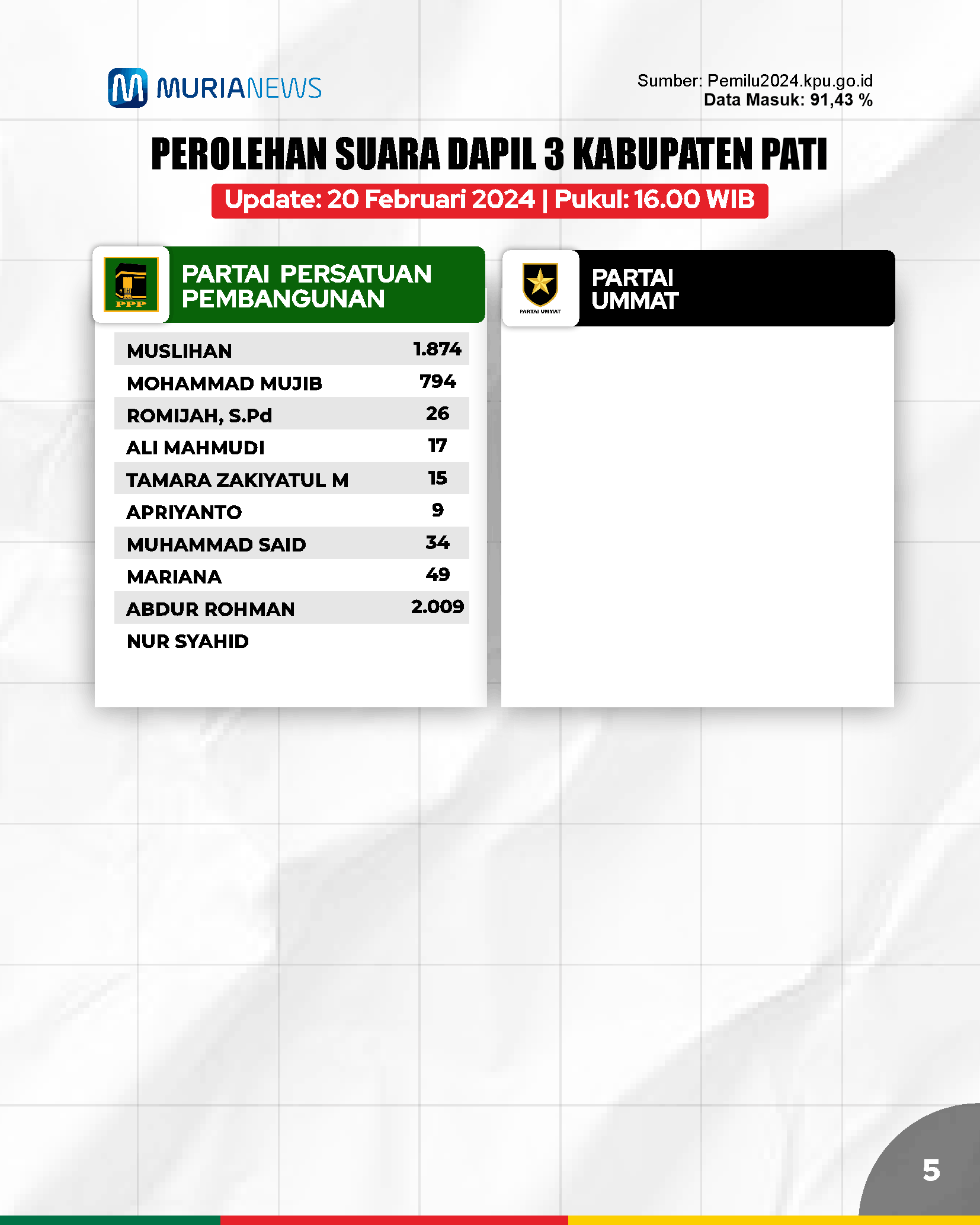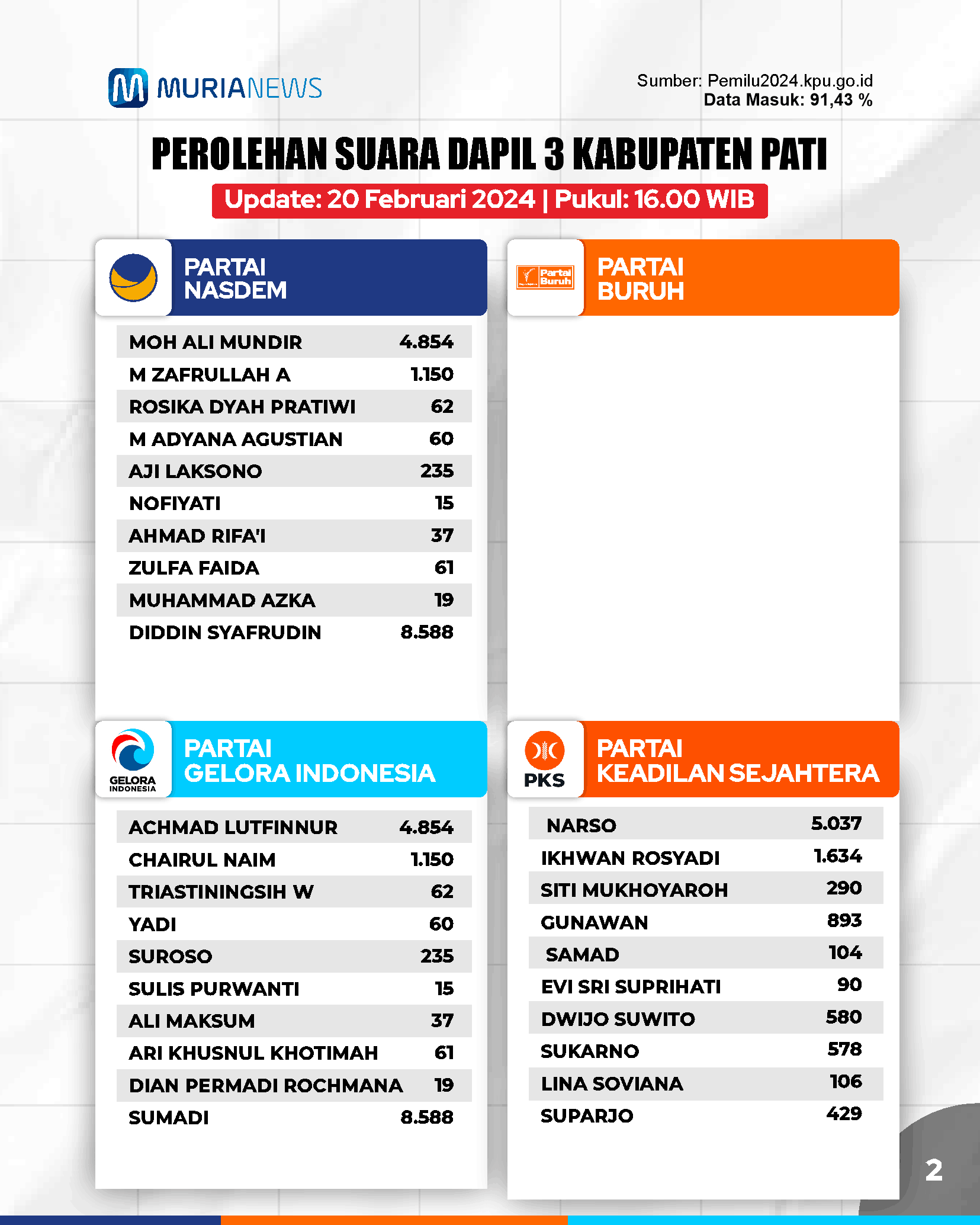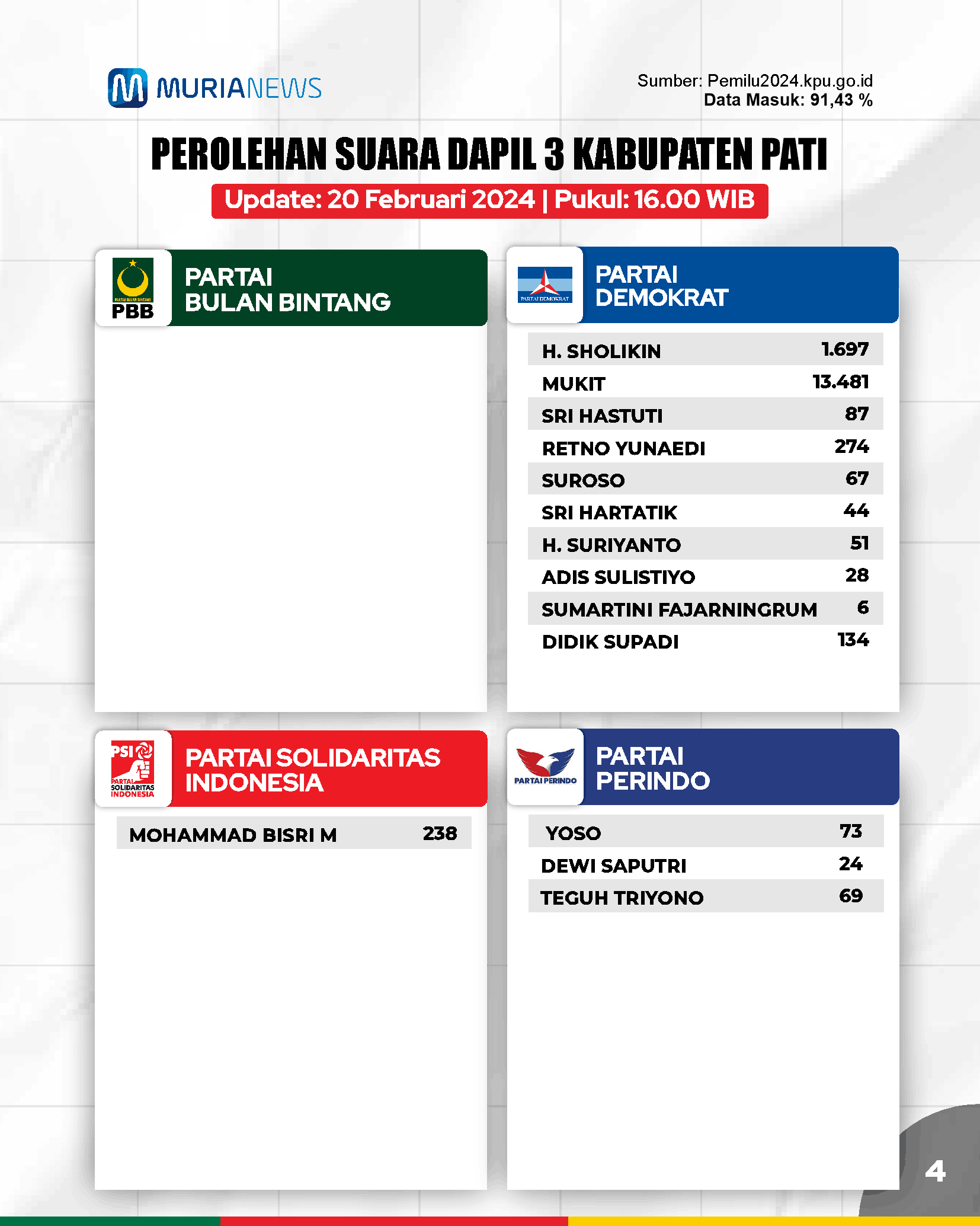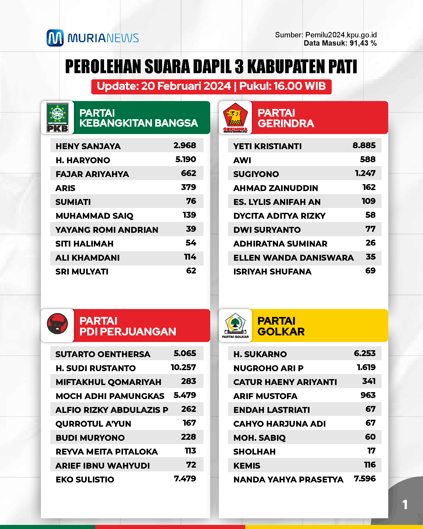 Murianews, Pati – Komisi Pemilihan Umum (KPU) RI mengeluarkan update suara Pileg Pati melalui real count penghitungan suara Pileg 2024. Hingga Selasa (20/2/2024) pukul 16.00 WIB, update suara Pileg Pati 2024 untuk Dapil 3 Pati sudah mencapai 91,43 persen.