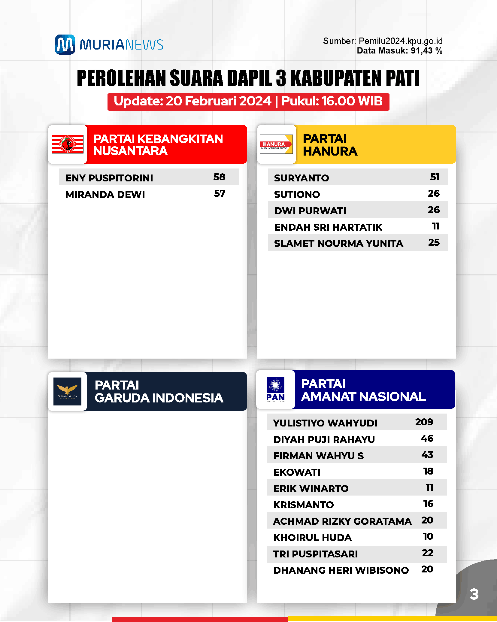 Update Suara Pileg Pati Dapil 3, 20 Februari 2024