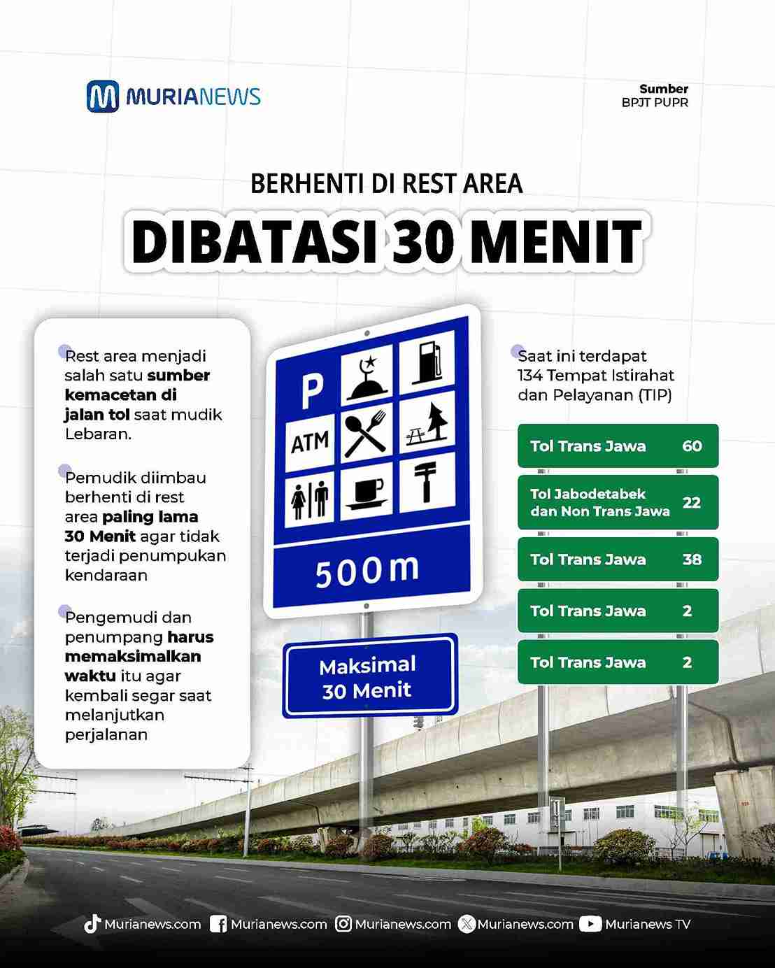Pihaknya menyatakan BPJT PU membatasi waktu pemudik berada di rest area atau Tempat, Istirahat, dan Pelayanan (TIP) maksimal selama 30 menit. Itu dilakukan guna menghindari penumpukan kendaraan di rest area dan menyebabkan kemacetan di Jalan Tol.