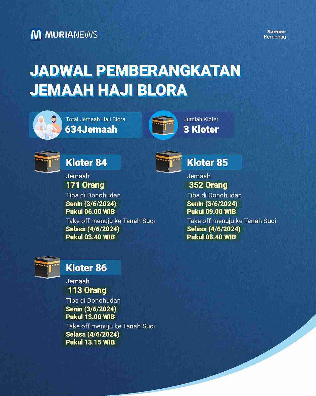 Untuk jemaah haji asal Kabupaten Blora, Jawa Tengah total ada 634 orang yang akan diberangkatkan. Mereka terbagi menjadi tiga kloter, yakni kloter 84, 85, dan 86.