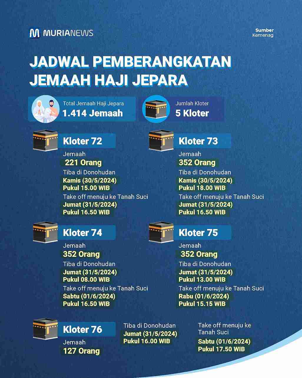 Untuk jemaah haji asal Kabupaten Jepara, Jawa Tengah total ada 1.414 orang yang akan diberangkatkan. Mereka terbagi menjadi lima kloter, yakni kloter 72, 73, 74, 75, dan 76.