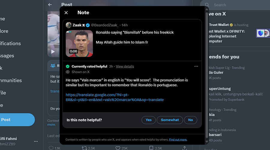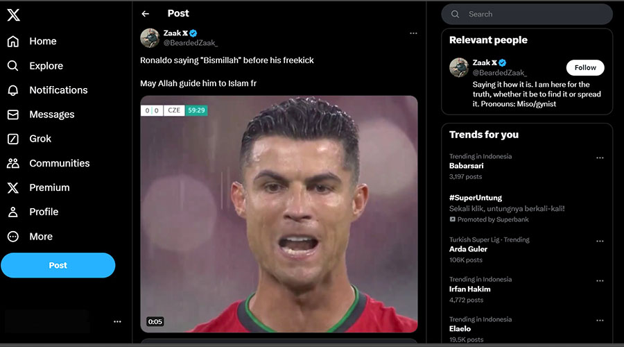 Klip saat Cristiano Ronaldo yang diyakini warganet mengucapkan bismillah itu ramai beredar di media sosial. Salah satunya diunggah akun X.