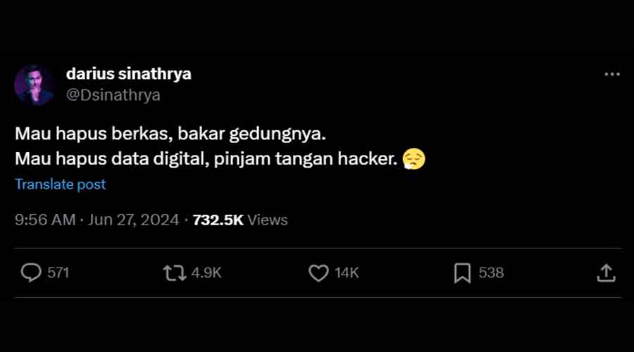 ’’Mau hapus berkas, bakar gedungnya. Mau hapus data digital, pinjam tangan hacker,’’ cuit Darius seperti dikutip, Jumat (28/6/2024).