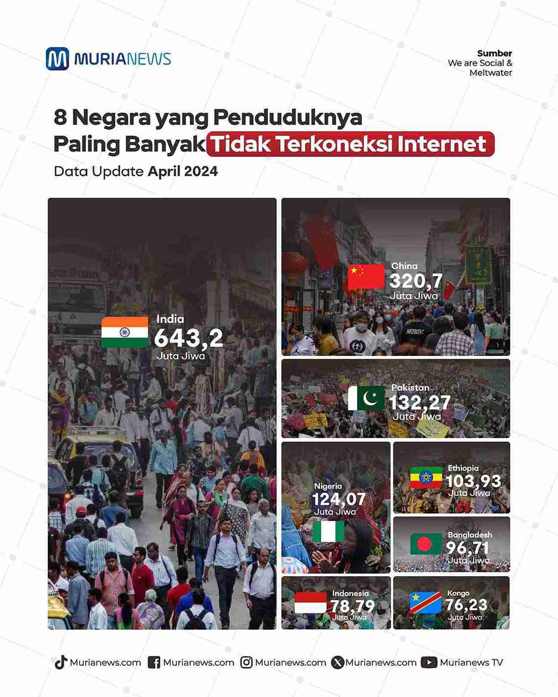 Di antara negara yang penduduknya tidak terkoneksi internet terbanyak, ada Indonesia. Negara kepulauan ini, menempati peringkat ke tujuh, negara dengan penduduk tak terkoneksi internet terbanyak.