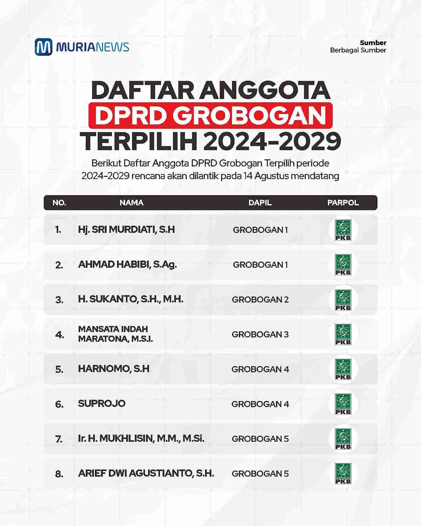 Murianews, Kudus – Sebanyak 50 anggota DPRD Grobogan periode 2024-2029 segera dilantik. Agenda pelantikan dijadwalkan tiba pada Rabu (14/8/2024).