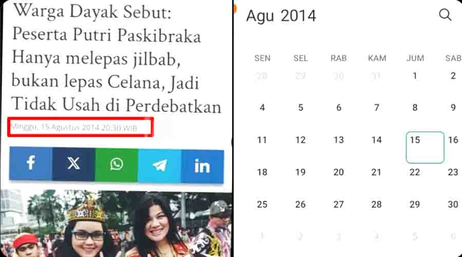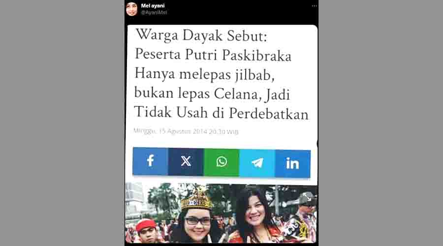 Narasi itu diunggah sebuah akun X dengan menyebarkan tangkap layar halaman judul pemberitaan yang menyebutkan ’’Warga Dayak Sebut: Peserta Putri Paskibraka Hanya melepas jibab, bukan lepas Celana, Jadi Tidak Usah di Perdebatkan’’.