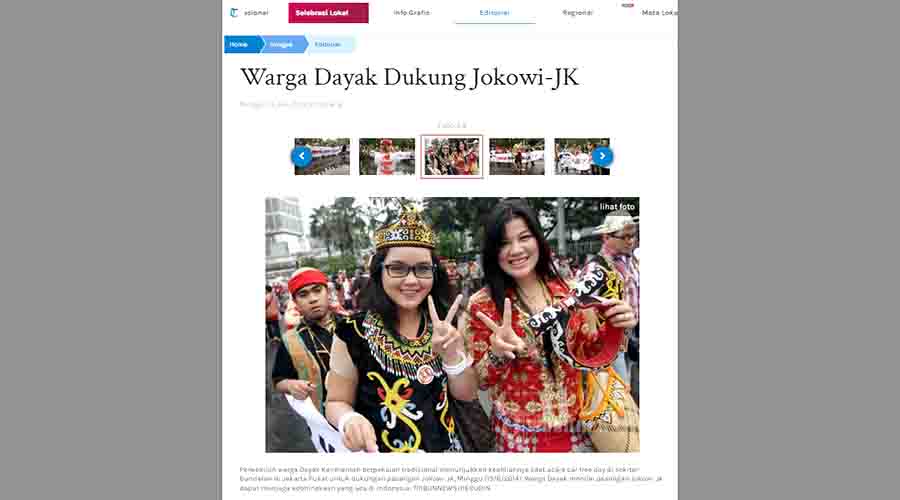 Konten Tribunnews.com berjudul Warga Dayak Dukung Jokowi-JK. Dalam caption yang disematkan, berbunyi sebagai berikut: