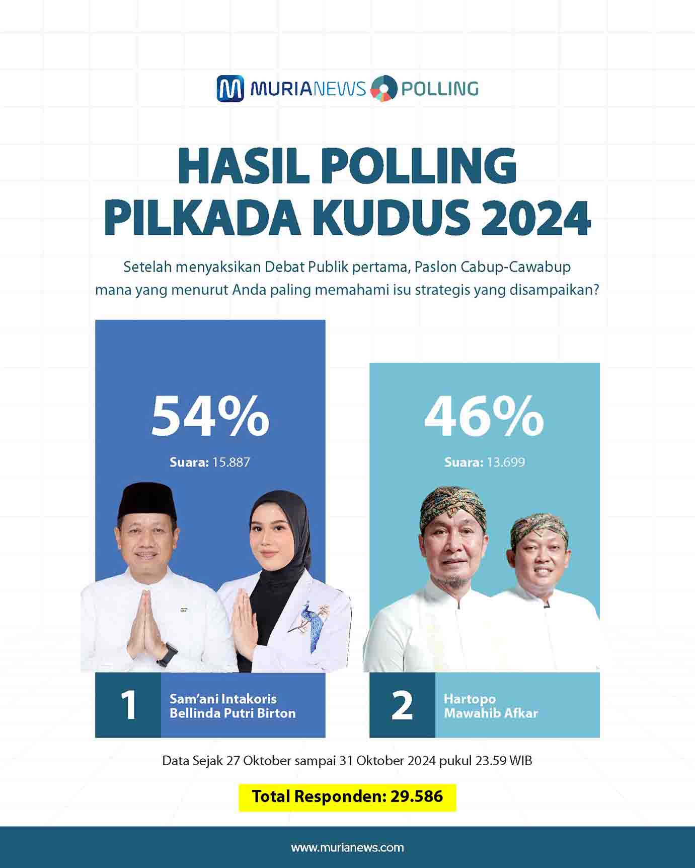 Dari 29.586 responden, sebanyak 54 persen menilai Sam'ani Intakoris dan Bellinda Putri Sabrina Birton lebih memahami isu strategis yang di Kabupaten Kudus ketimbang pasangan Hartopo dan Mawahib Afkar yang mendapatkan 46 persen.
