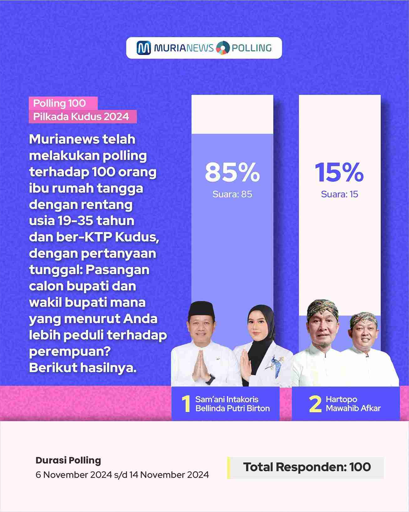 Paslon Samani dan Bellinda dinilai lebih pro terhadap perempuan. Hal ini tercermin dalam Polling 100 yang dilakukan Murianews.com terhadap 100 orang ibu rumah tangga ber-KTP Kudus berusia 19-35 tahun pada tanggal 6-14 November 2024.